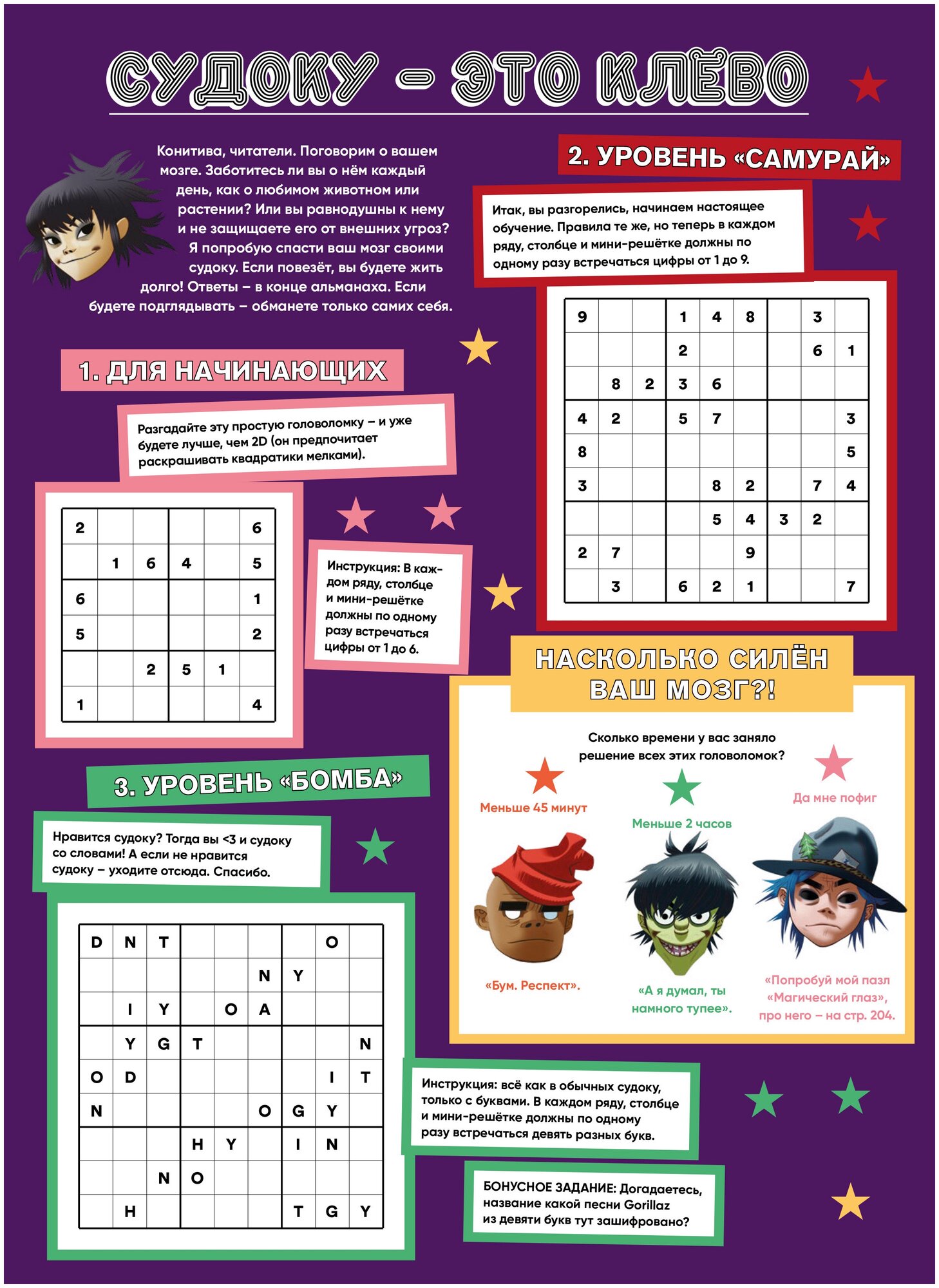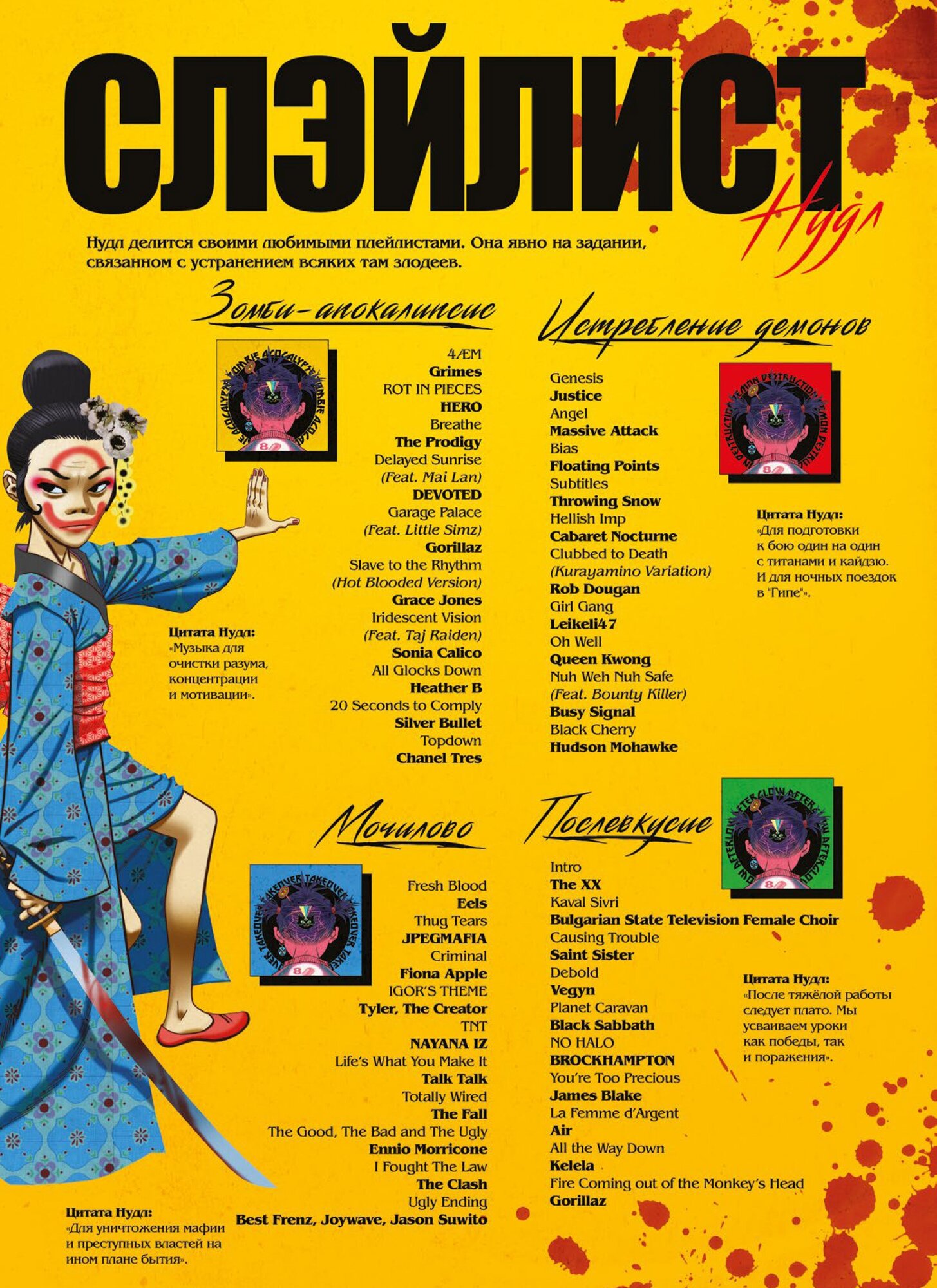Знали ли вы, что Мёрдок, основатель группы и непревзойдённый бас-гитарист, в своё время написал мемуары? В этой книге вас ждёт сочный отрывок из этого гримуара! Расс, как истинный киноман, расскажет о своих любимых фильмах! Нудл во всех подробностях промурлычет о музыке, помогающей ей устраивать бойню (музыкальную, конечно), а 2D проведёт мастер-класс по… штанам?! Да уж, от этого квартета всего можно ожидать!