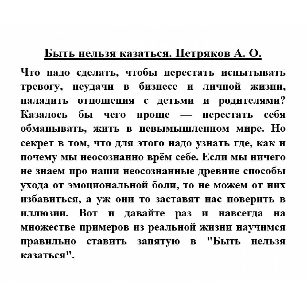 Что надо сделать, чтобы перестать испытывать тревогу, неудачи в бизнесе и личной жизни, наладить отношения с детьми и родителями? Казалось бы чего проще - перестать себя обманывать, жить в невымышленном мире. Но секрет в том, что для этого надо узнать где, как и почему мы неосознанно врём себе. Если мы ничего не знаем про наши неосознанные древние способы ухода от эмоциональной боли, то не можем от них избавиться, а уж они то заставят нас поверить в иллюзии. Вот и давайте раз и навсегда на множестве примеров из реальной жизни научимся правильно ставить запятую в "Быть нельзя казаться".