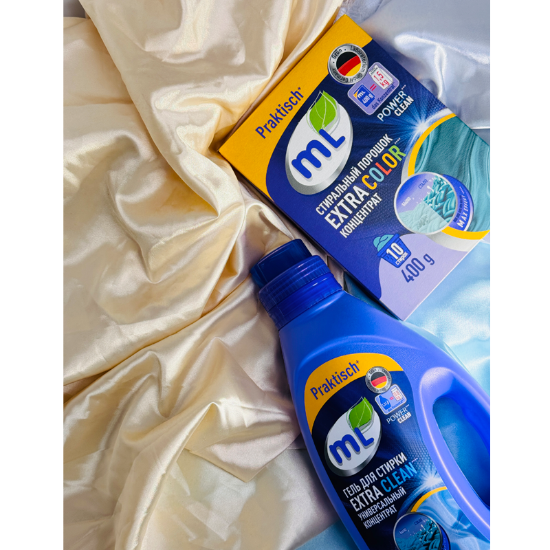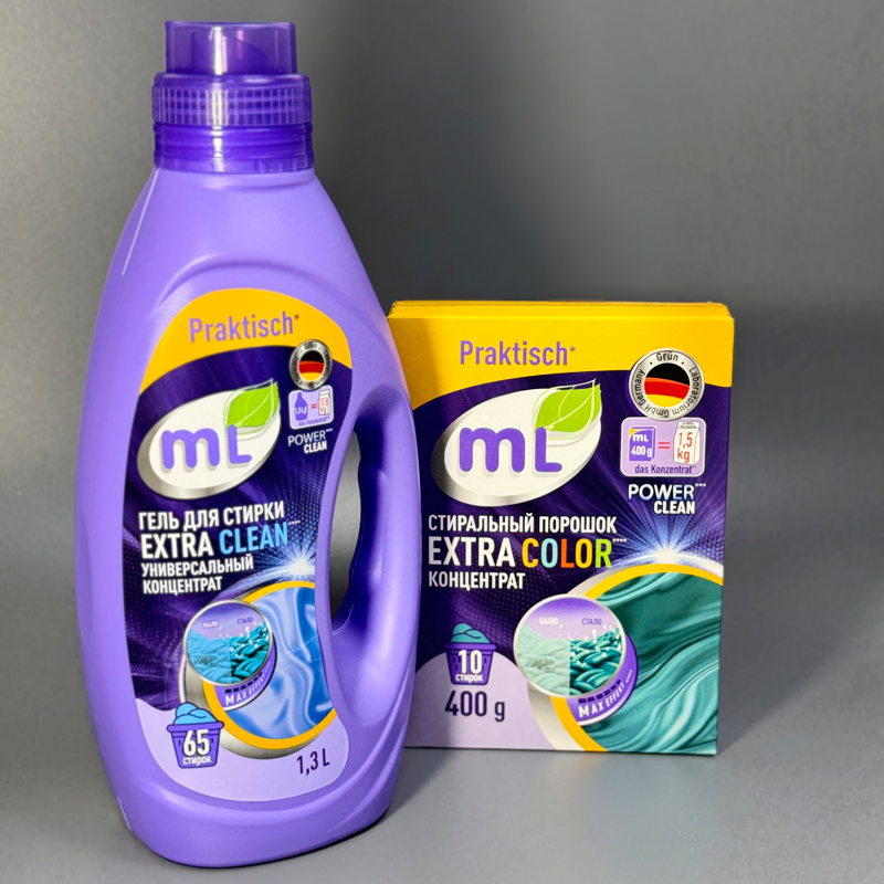 Универсальный гель-концентрат для стирки цветного и белого белья mL EXTRA CLEAN, 1,3 л., разработанный под контролем немецкой фабрики бытовой химии GruenLab, подходит стирки вещей в воде любой жесткости и температуры от 30 до 60°С. Гель эффективно отстирывает загрязнения как в холодной, так и горячей воде, а также используется для стирки как в стиральной машине автомат, так и для ручной стирки.