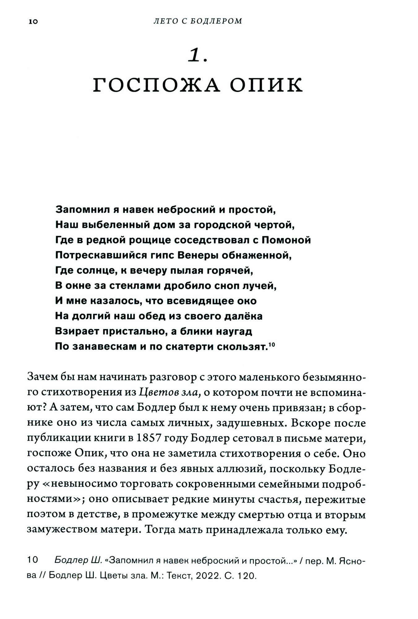 Хотя и не про лето вовсе, и как-то интуитивно начала читать, прямо-таки сразу как книга появилась в продаже. Люблю Бодлера и автора книги. Вроде бы уже все написали про француза, но Компаньон как-то удивительно переворачивает его биографию и стихотворения, что как бы и знаешь все уже о нем, и в то же время что-то новое \"вылетает\", новые смысли и понимание жизни поэта.