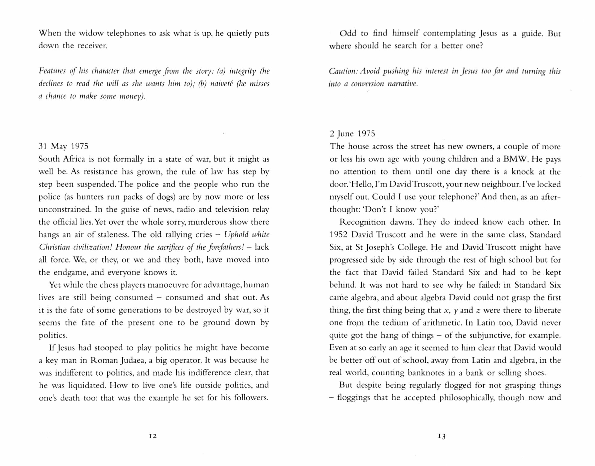 A young English biographer is working on a book about the late writer, John Coetzee. He plans to focus on a period in the seventies when, the biographer senses, Coetzee was 'finding his feet as a writer'. He embarks on a series of interviews with people who were important to Coetzee - a married woman with whom he had an affair, his favourite cousin Margot, a Brazilian dancer whose daughter had English lessons with him, former friends and colleagues. Thus emerges a portrait of the young Coetzee as an awkward, bookish individual, regarded as an outsider within the family. His insistence on doing manual work, his long hair and beard, and rumours that he writes poetry evoke nothing but suspicion in the South Africa of the time.