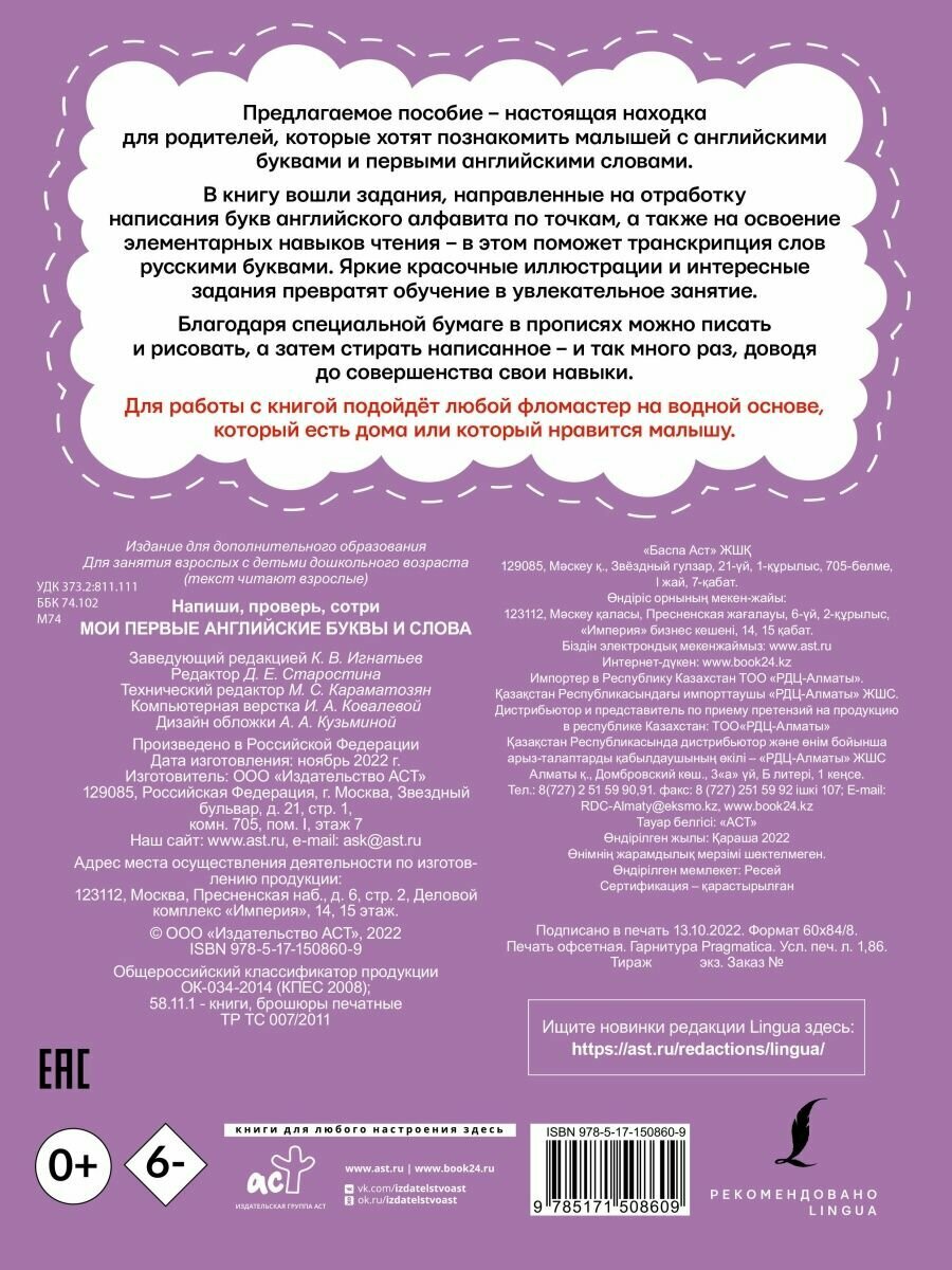 Предлагаемая книга - настоящая находка для родителей, которые хотят познакомить малышей с английскими буквами и первыми английскими словами. В книгу вошли задания, направленные на отработку написания букв английского алфавита по точкам, а также на освоение элементарных навыков чтения - в этом поможет транскрипция слов русскими буквами. Яркие красочные иллюстрации и интересные задания превратят обучение в увлекательное занятие. Благодаря специальной бумаге в прописях можно писать и рисовать, а затем стирать написанное - и так много раз, доводя до совершенства свои навыки. Для работы с книгой подойдет любой фломастер на водной основе, который есть дома или который нравится малышу.