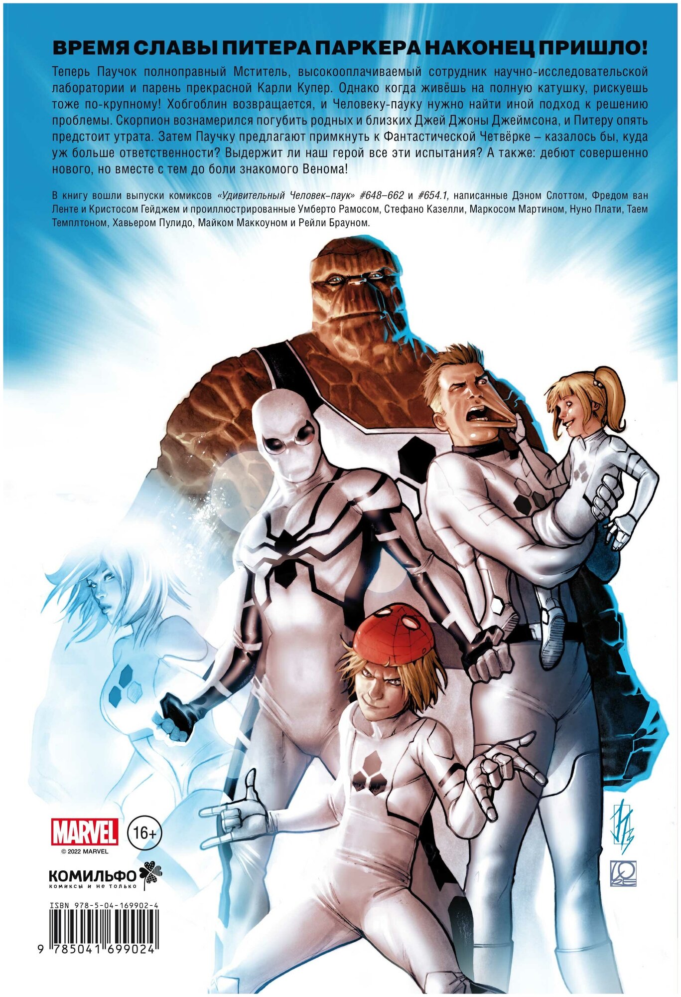 В книгу вошли выпуски комиксов "Удивительный Человек-паук" #648-662 и #654.1, написанные Дэном Слоттом, Фредом ван Ленте и Кристосом Гейджем и проиллюстрированные Умберто Рамосом, Стефано Казелли, Маркосом Мартином, Нуно Плати, Таем Темплтоном, Хавьером Пулидо, Майком Маккоуном и Рейли Брауном.