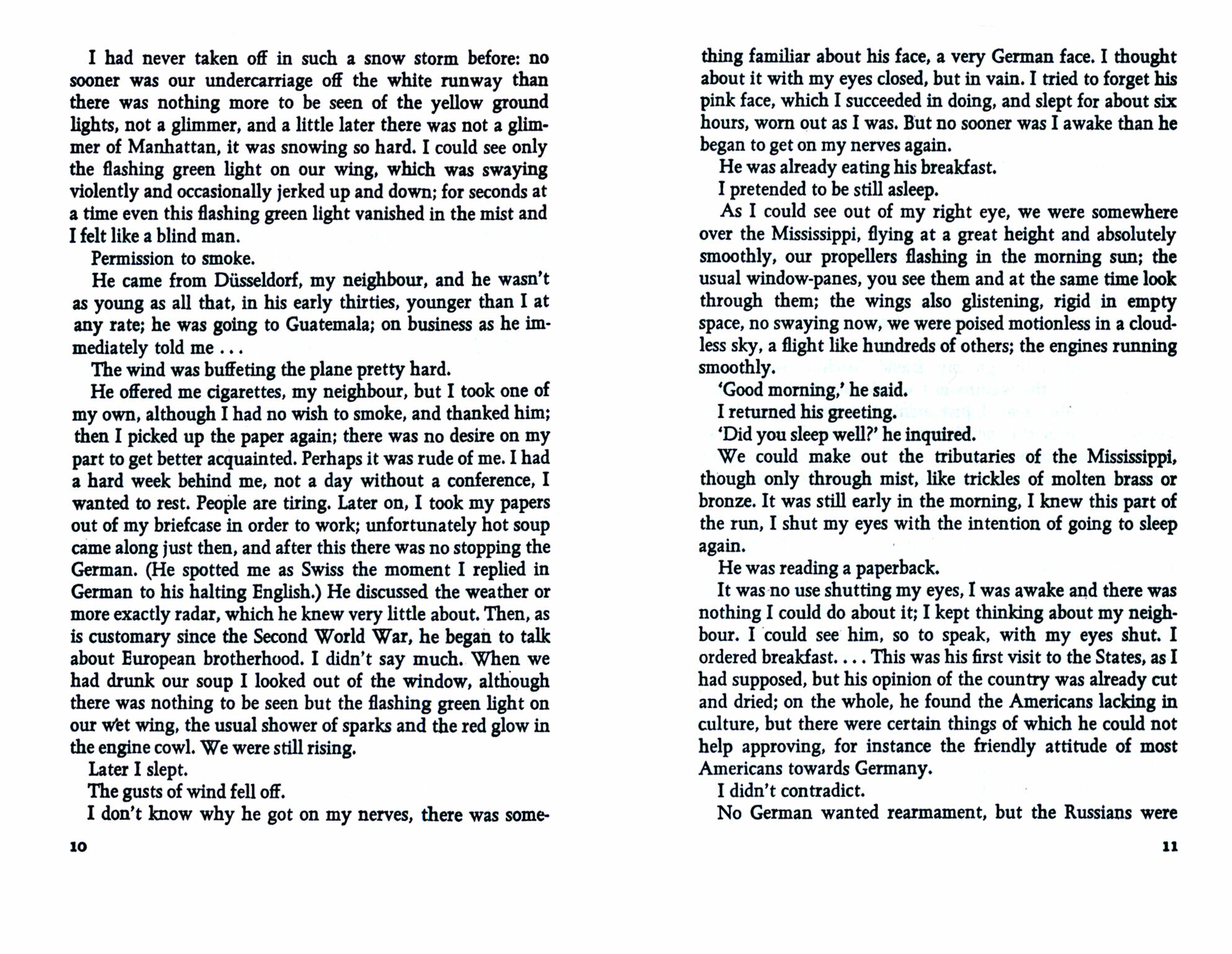 The novel tells the story of a middle-class UNESCO engineer called Walter Faber, who believes in rational, calculated world. Strange events undermine his security - an emergency landing in a Mexican desert against all odds, his friend Joachim hangs himself in the Mexican jungle, and he falls in love with a woman who dies of a concussion, he has an incestuous affair. Finally Faber becomes ill with stomach cancer, but it is too late for him to change his life.