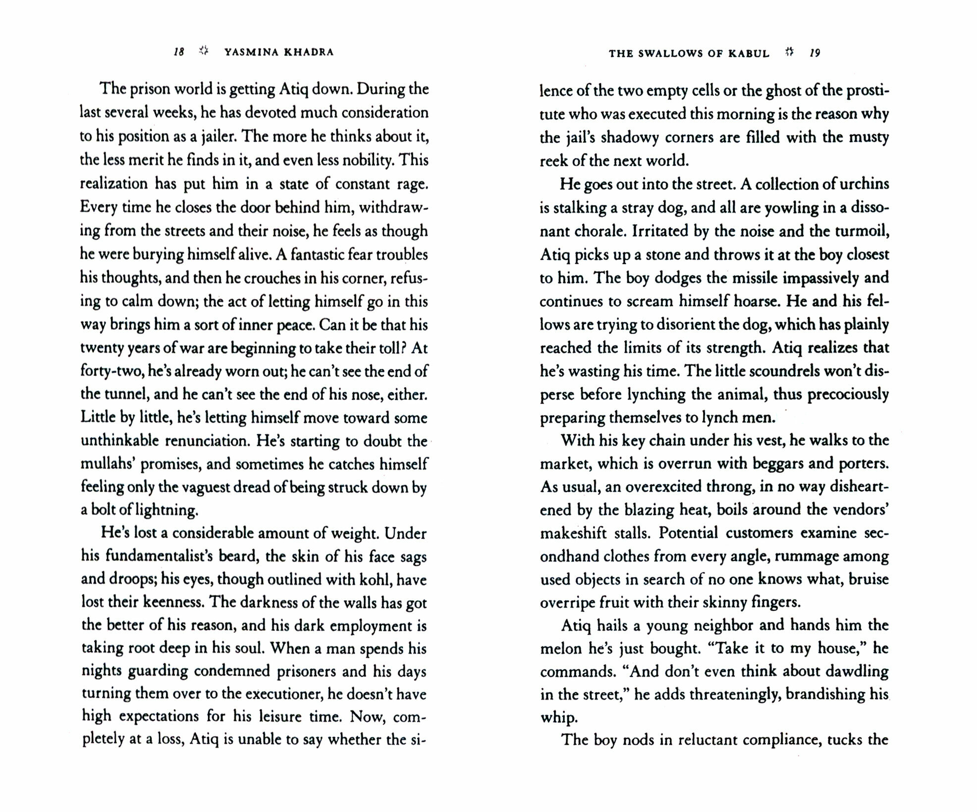 The Swallows of Kabul is an astounding and elegiac novel of four people struggling to hold on to their humanity in a place where pleasure is a deadly sin and death has become routine.