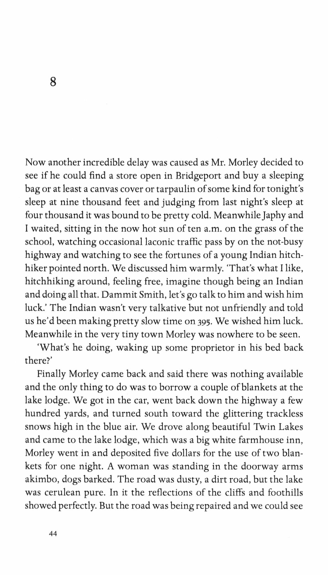 Бродяги Дхармы: «Hopping a freight out of Los Angeles at high noon one day in late September 1955 I got on a gondola and lay down with my duffel bag under my head and my knees crossed and contemplated the clouds as we rolled north to Santa Barbara». Керуак дает нам бессвязный шедевр - предложение без знаков препинания, но при этом насыщенное описаниями и характерами. Бедность/свобода, хипповая Калифорния (Лос-Анджелес, Санта-Барбара), ленивое созерцание облаков - все это является центральным моментом в характере рассказчика и его отношении к происходящему. Он един с дорогой («we rolled north») и пребывает в медитативном настроении, и этим чувством пропитана каждая страница этой зажигательной, юмористической классики бит-поколения. При одном только прочтении этой фразы хочется сбросить с себя хомут общества и... ладно, хватит об этом...