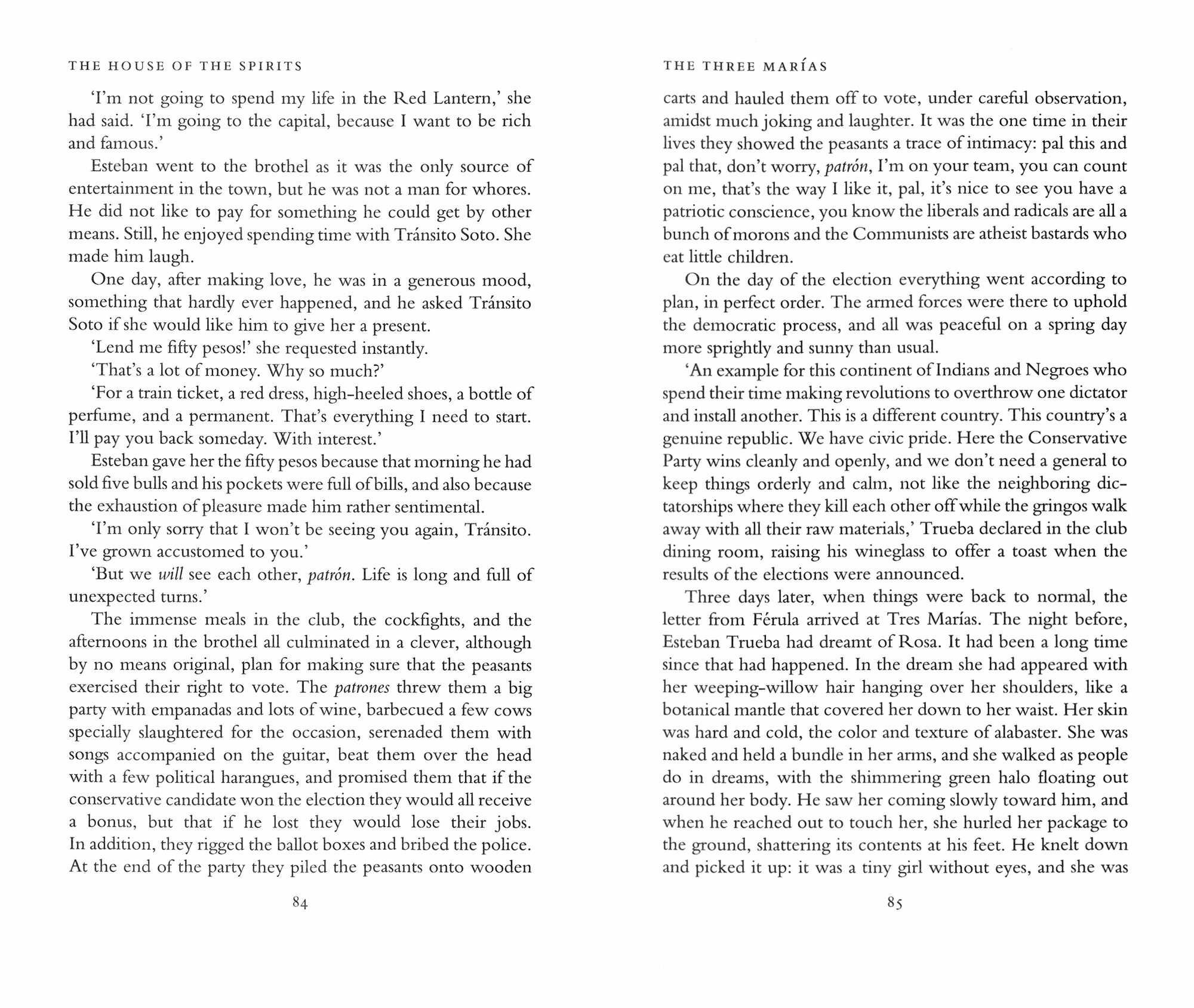 Her husband-to-be is Esteban Trueba, a stern, willful man, given to fits of rage and haunted by a profound loneliness. At the age of thirty-five, he has returned to the capital from his country estate to visit his dying mother and to find a wife. (He was Rosa's fiance, and her death has marked him as deeply as it has Clara.) This is the man Clara has foreseen - has summoned - to be her husband; Esteban, in turn, will conceive a passion for Clara that will last the rest of his long and rancorous life.