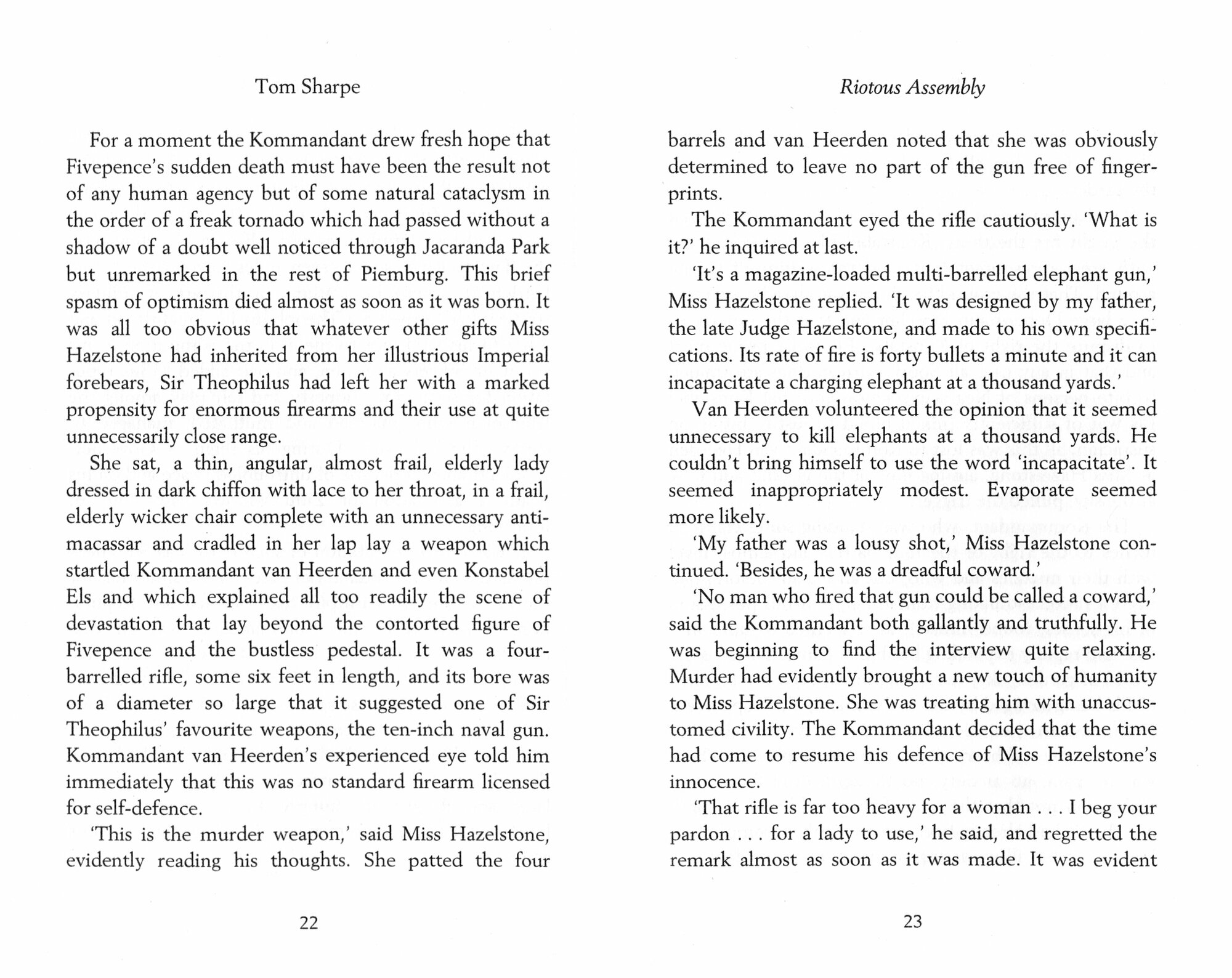 Not a 'political' novel in any previously imagined sense, Riotous Assembly provided a completely fresh approach to the South African scene - an approach startling in its deadpan savagery and yet also outrageously funny.
