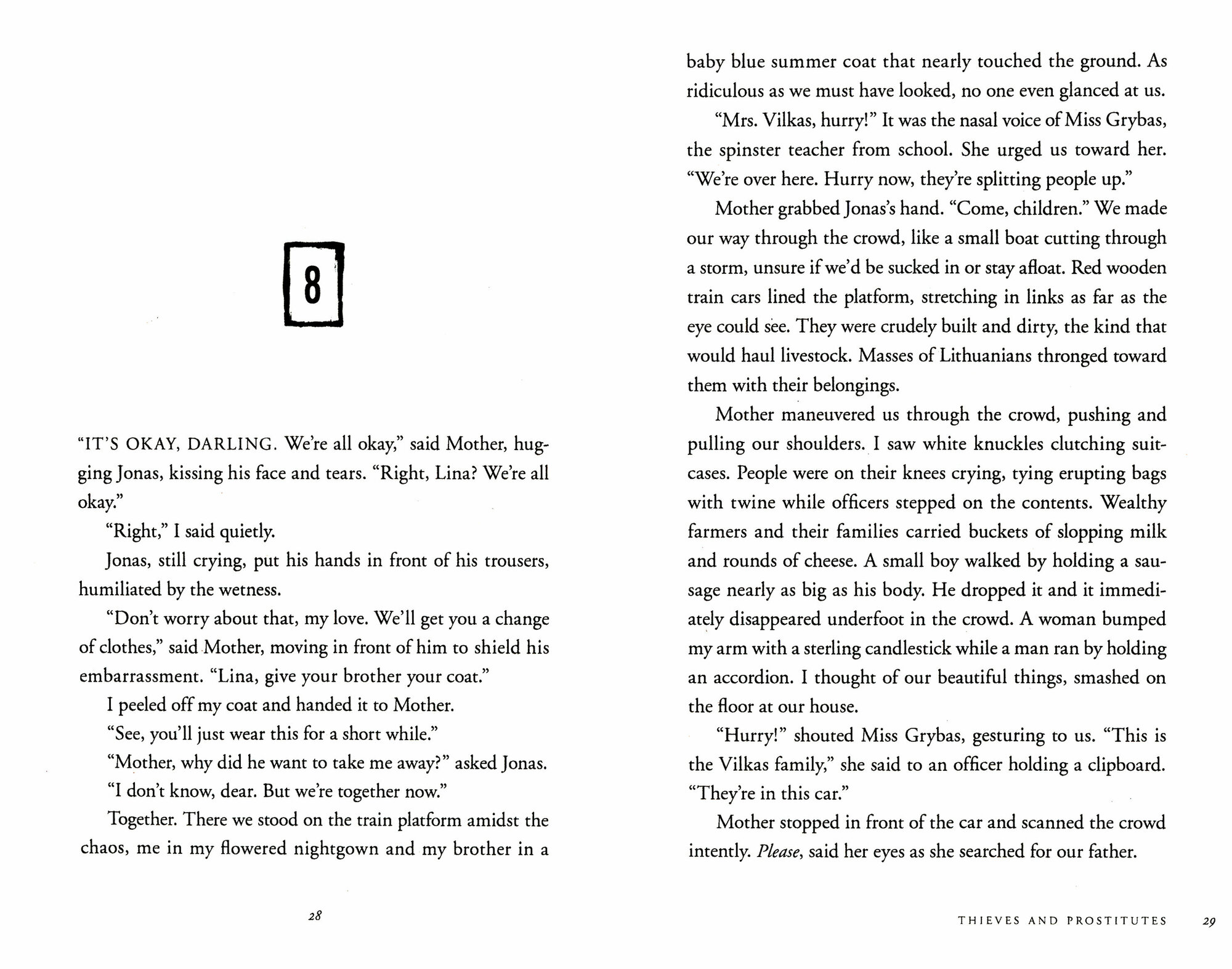 One night fifteen-year-old Lina, her mother and young brother are hauled from their home by Soviet guards, thrown into cattle cars and sent away. They are being deported to Siberia.
