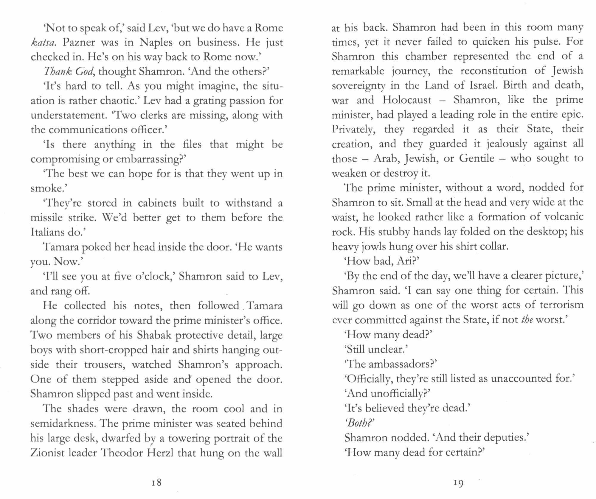 On a bright morning in Rome, a terrible explosion rips a hole in the Israeli embassy. Moments later, four gunmen cut down survivors as they stagger from the burning building. Gabriel Allon is hastily recalled to Israel and drawn once more into the heart of the secret service he'd hoped to leave behind. For the blast has led to a disturbing revelation: a dossier that strips away Allon's secrets and lays bare his history. A dossier that had fallen into terrorist hands…
