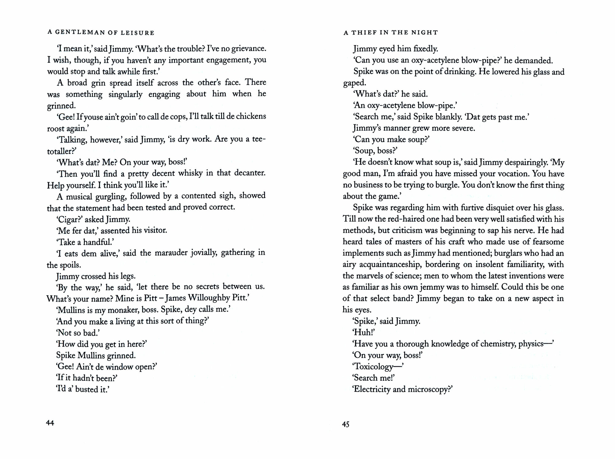 In this comic novel - dedicated to Douglas Fairbanks, who starred in the stage version - Jimmy Pitt, man-about-town and former newspaper hound, takes a bet that he cannot commit burglary. He finds breaking and entering easy enough, but then discovers that he has forced his way into the home of a tough New York policeman. Naturally, Captain McEachern has a beautiful daughter and problems of his own. The complications which ensue from their meeting, involving a rich cast of Wodehousean characters from both sides of the Atlantic, create one of his most amusing and light-hearted early novels.