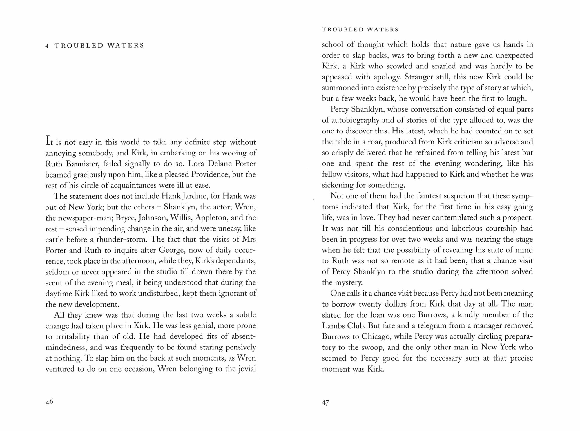The nearest Wodehouse ever came to a serious story, The Coming of Bill is a fascinating blend of social comment and light comedy. It concerns the offspring of Ruth, a spoilt heiress, and Kirk, an impecunious artist of perfect physique, brought together by Ruth’s aunt, a believer in eugenics. The young couple are eventually successful in retrieving their child and their marriage from the influence of the overbearing Mrs Porter, but only after a series of comic mishaps in a book which features a galaxy of vintage Wodehouse characters, including the bossy aunt, a tetchy millionaire, a good-natured ex-boxer and an orotund English butler.