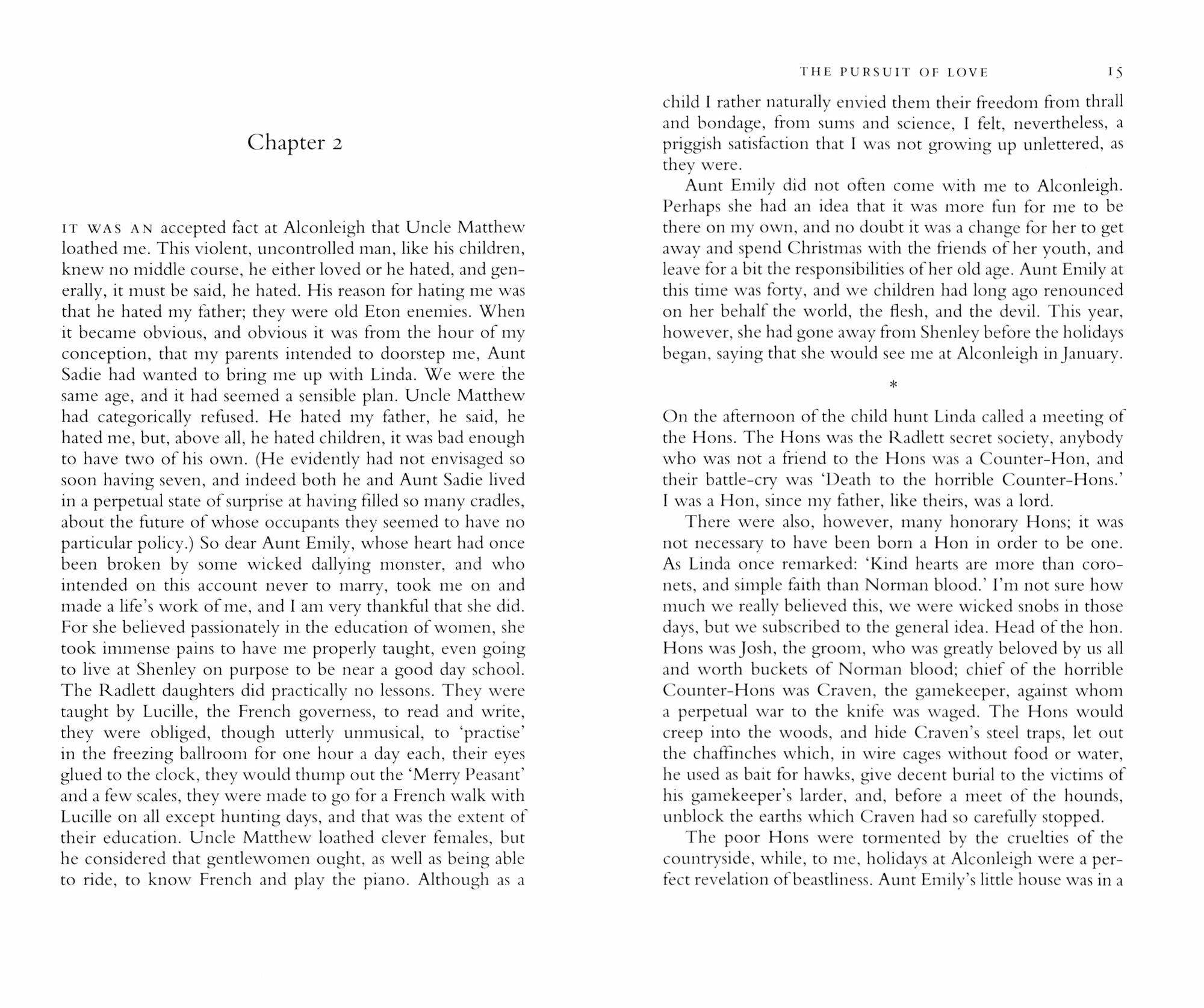 Nancy Mitford modelled the characters in her best-known novels on her own unconventional (and at the time of writing, notorious) family. We are introduced to the Radletts through the eyes of their cousin, Fanny ('the Bolter's girl'), on one of her frequent visits to their country estate: Uncle Matthew the blustering patriarch, owner of that bloodied entrenching tool above the fireplace, who hunts his children with bloodhounds; vague Aunt Sadie, and six children recklessly eager to grow up.