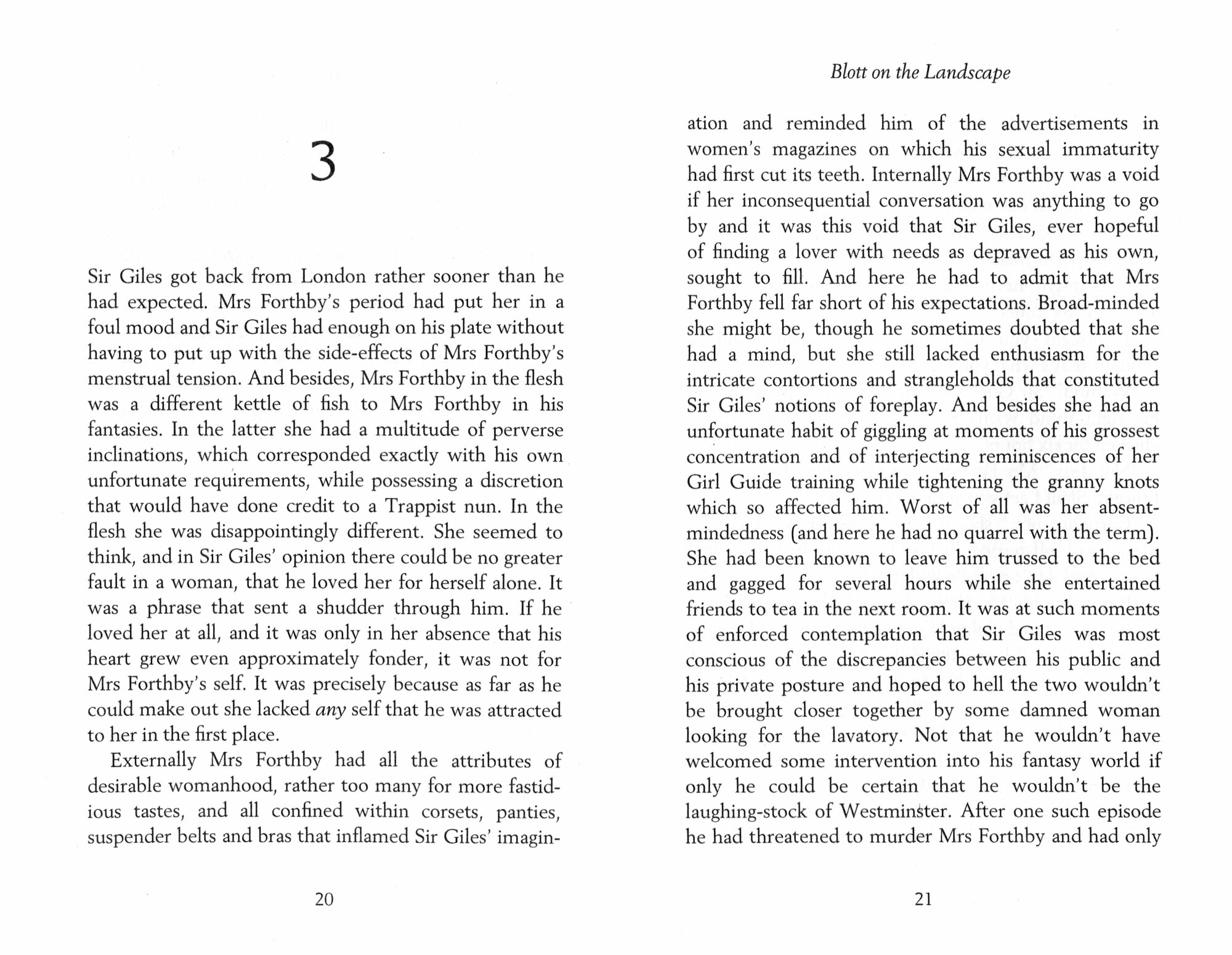 The landscape is flawless, the trees majestic, the flora and the fauna are right and proper. All is picturesquely typical of rural England at its best. Sir Giles, an MP of few principles and curious tastes, plots to destroy all this by building a motorway smack through it, to line his own pocket and at the same time to dispose of his wife, the capacious Lady Maude.