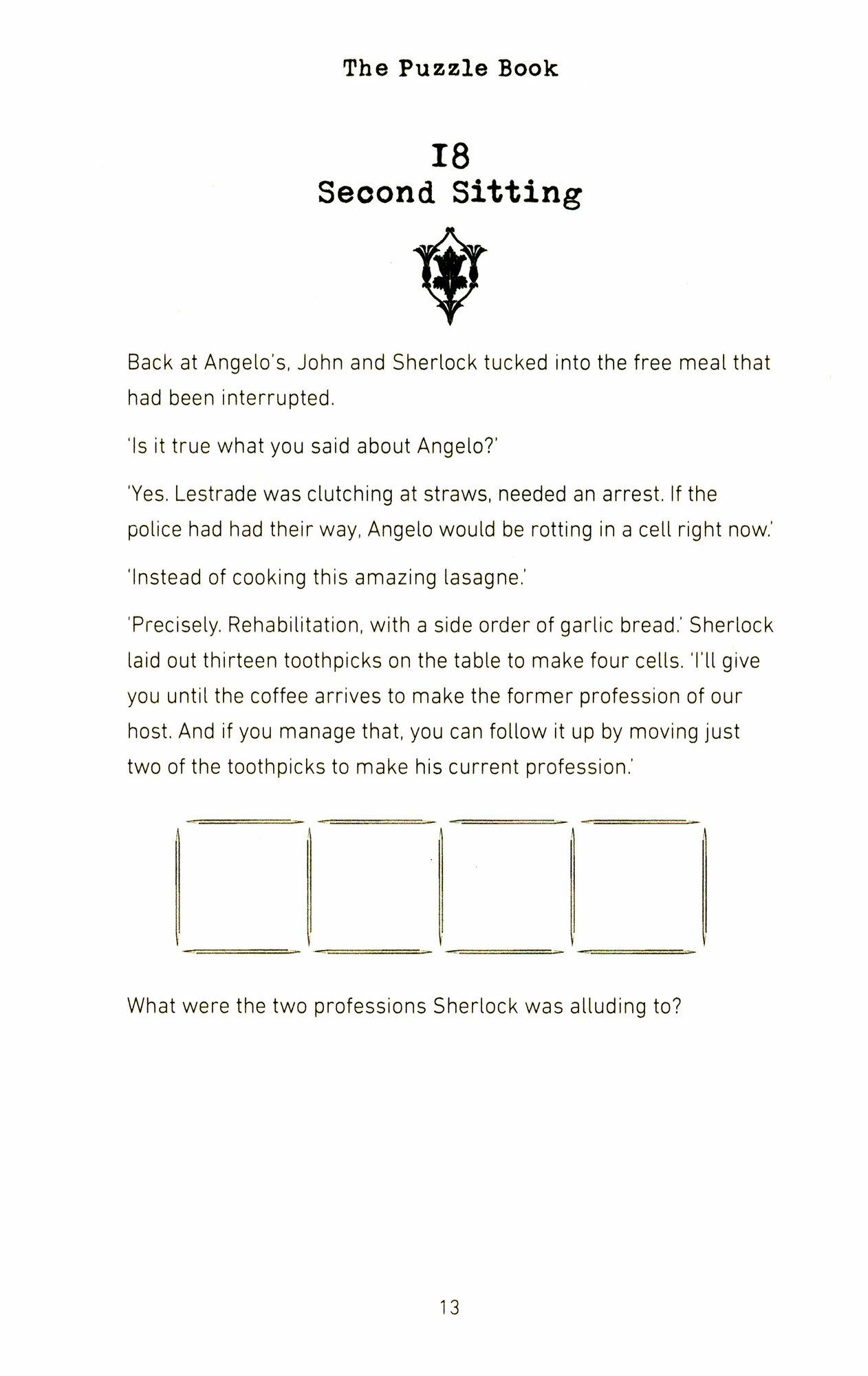 From codes and sequences to perceptual and logic problems, there are puzzles for all levels, from beginner to expert. With explanations of how Sherlock (and hopefully you) arrived at the solutions, this official puzzle book is your chance to learn how to think like Sherlock. Step inside his mind palace, decipher Moriarty's taunting clues and find out if you're a match for the brains of 221b Baker Street.