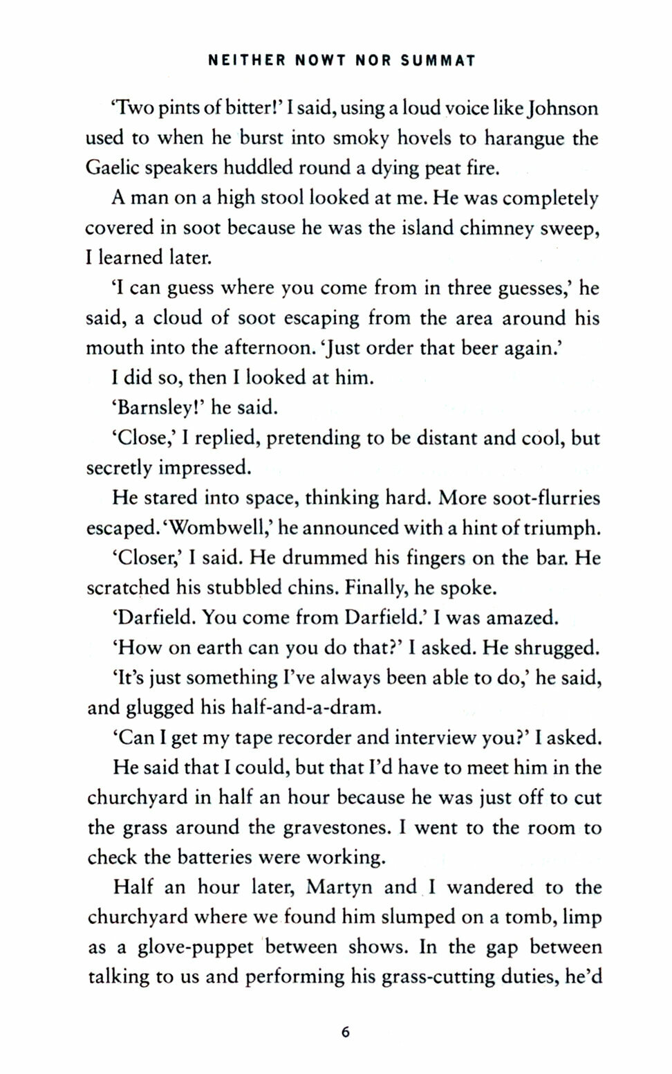 I’m going to define the essence of this sprawling place as best I can. I’m going to start here, in this village, and radiate out like a ripple in a pond. I don’t want to go to the obvious places, either; I want to be like a bus driver on my first morning on the job, getting gloriously lost, turning up where I shouldn’t. I’m going to confirm or deny the cliches, holding them up to see where the light gets in. Yorkshire people are tight. Yorkshire people are arrogant. Yorkshire people eat a Yorkshire pudding before every meal. Yorkshire people solder a t’ before every word they use...