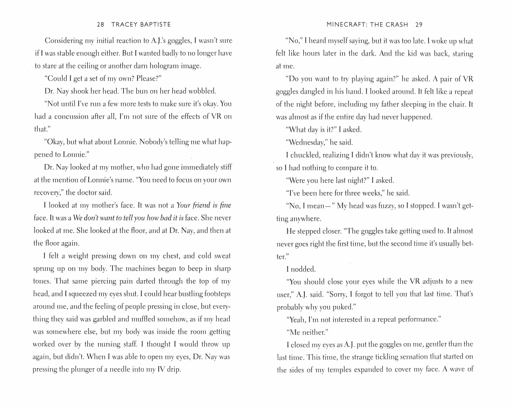 Waking up in the hospital, Bianca is faced with questions she’s not equipped to answer. She chooses instead to try a virtual-reality version of Minecraft that gives her control over a world at the very moment she thought she’d lost it. There she encounters a glitching avatar she believes to be Lonnie. Bianca teams up with Esme and Anton – two kids also playing on the hospital server – to save her friend.