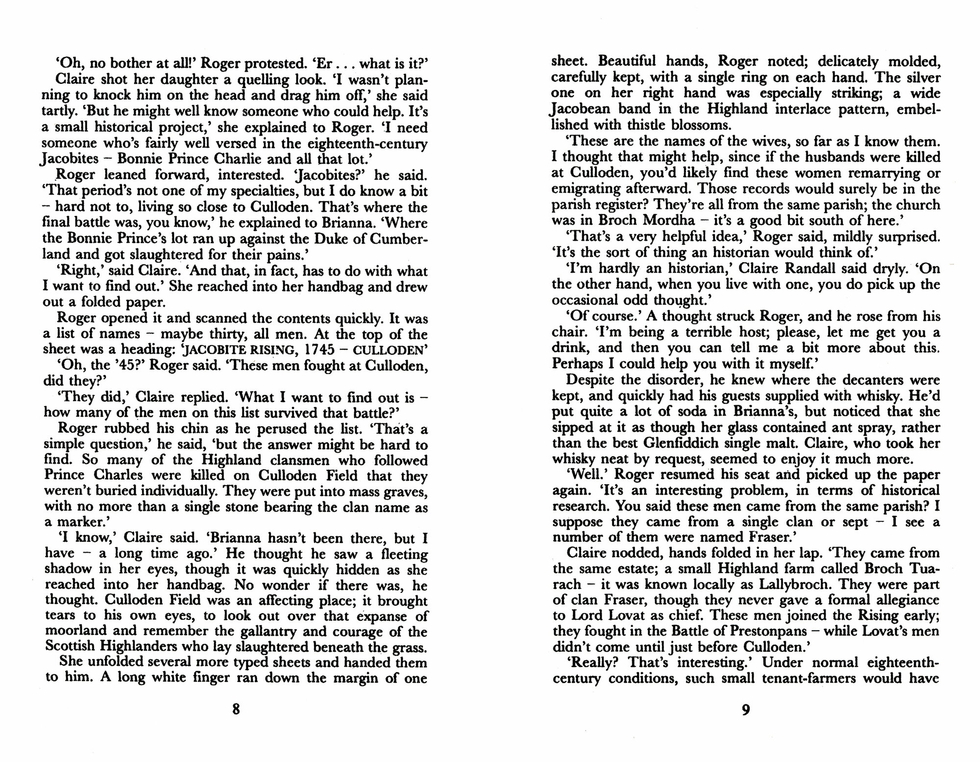 For twenty years Claire Randall has kept her secrets. But now she is returning with her grown daughter to the majesty of Scotland's mist-shrouded hills. Here Claire plans to reveal a truth as stunning as the events that gave it birth: about the mystery of an ancient circle of standing stones, about a love that transcends the boundaries of time, and about James Fraser, a warrior whose gallantry once drew the young Claire from the security of her century to the dangers of his.
