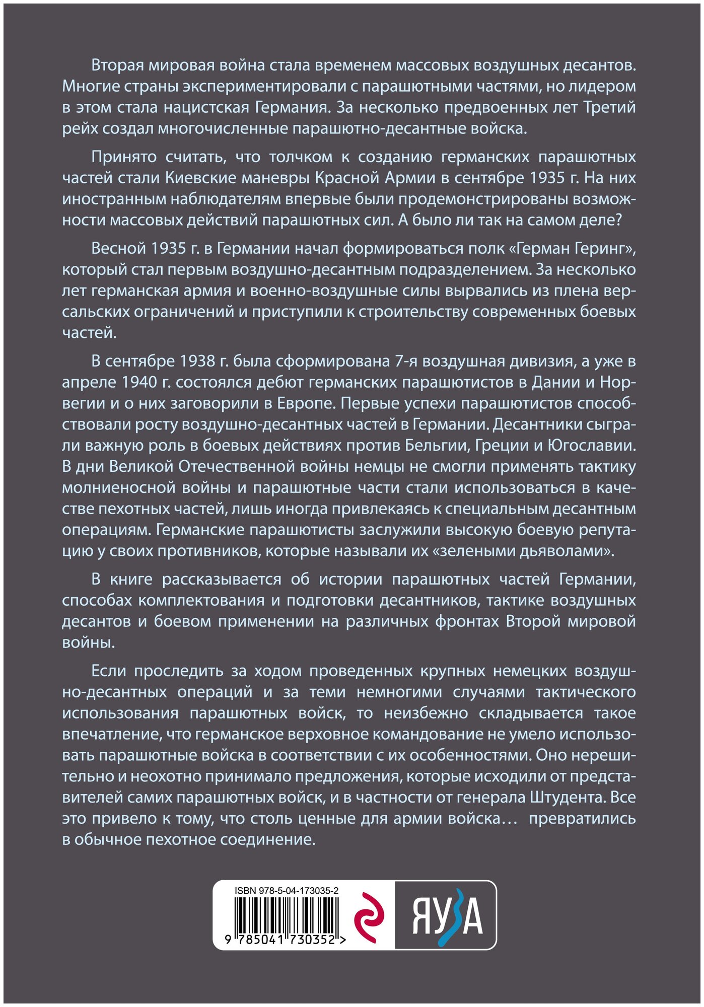 В книге рассказывается об истории парашютных частей Германии, способах комплектования и подготовки десантников, тактике воздушных десантов и боевом применении на различных фронтах Второй мировой войны.