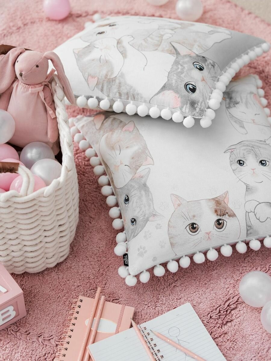 Квадратная декоративная подушка «Китти» – это сочетание оригинального детского рисунка с комфортной, мягкой тканью наволочки из натурального 100% хлопка.Хлопковый текстиль – лучший выбор для детской комнаты. Он хорошо впитывает влагу и пропускает воздух, ребенку будет комфортно прилечь на такую подушку. Наволочка не вызывает раздражения, не накапливает статическое электричество.Внутри подушки – искусственный лебяжий пух, высококачественное микроволокно, мягкое, нежное и одновременно упругое. Этот наполнитель эластичен и быстро восстанавливает свою форму после сжатия, поэтому подушка не деформируется, ее удобно использовать во время дневного отдыха.Что может быть милее принта с красивыми котятами? «Китти» понравится не только детям, но и их родителям. Несколько симпатичных котят с выразительными глазками украшают эту декоративную подушку. Оригинальный рисунок был разработан дизайнерами Togas специально для детской коллекции. Края изделия декорированы симпатичными круглыми помпончиками.