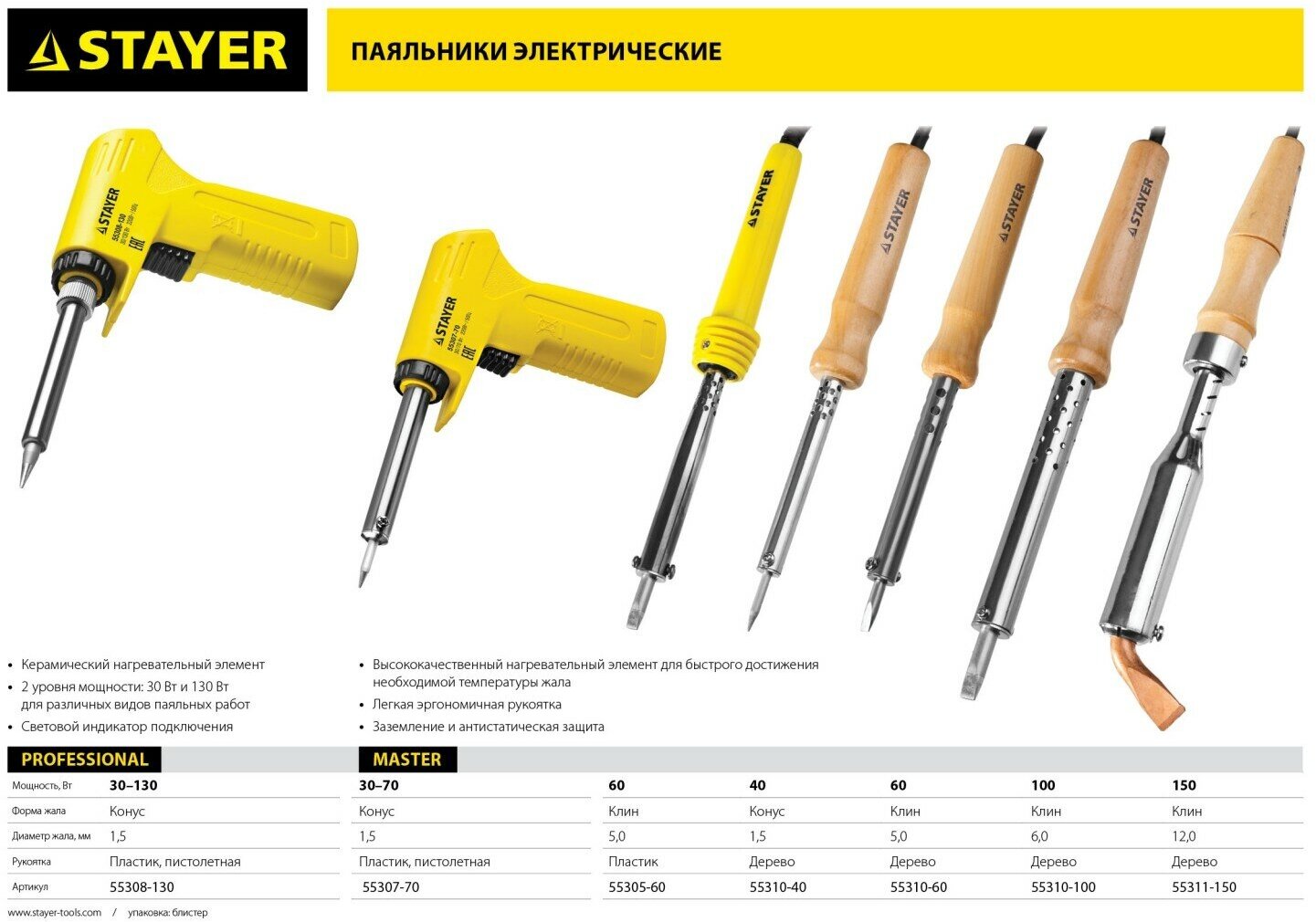 Паяльное оборудование ″STAYER″ разработано в соответствии с самыми высокими требованиями и обеспечивает качественную работу на протяжении всего срока службы. Применяются для пайки медных проводников, отпайки и лужения.