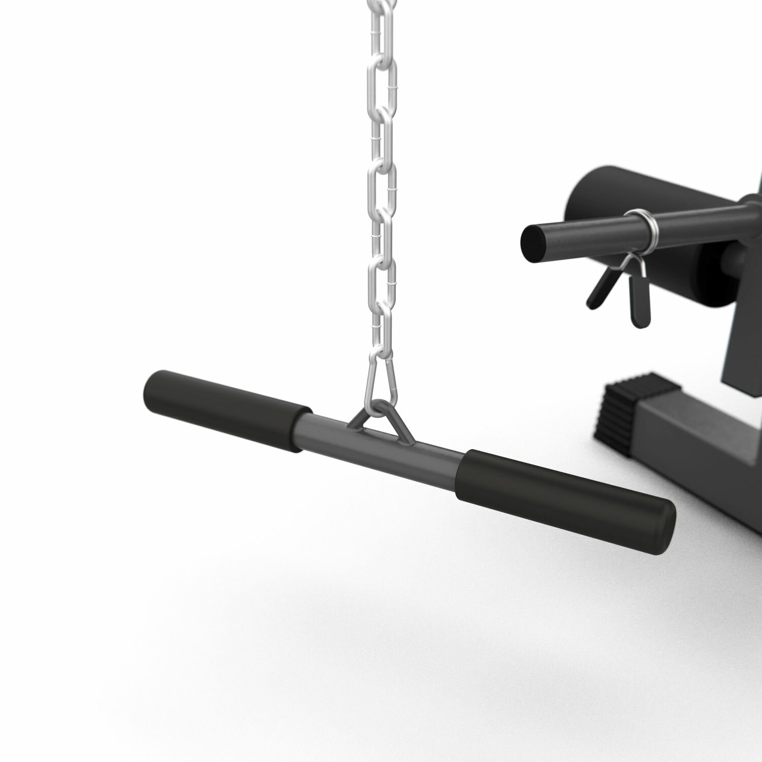 В комплекте парта для бицепса, съёмные валики и ручка для тяги на цепи. Нагрузка на стойки до 120 кг, на парту – до 80 кг, на рычаг для валиков и ручки для тяги – до 80 кг.