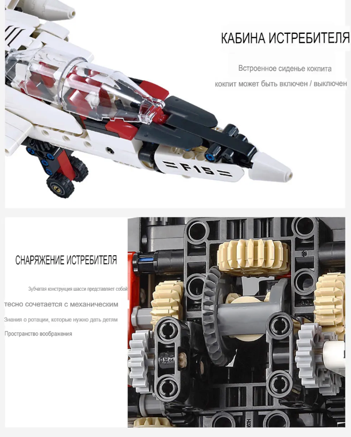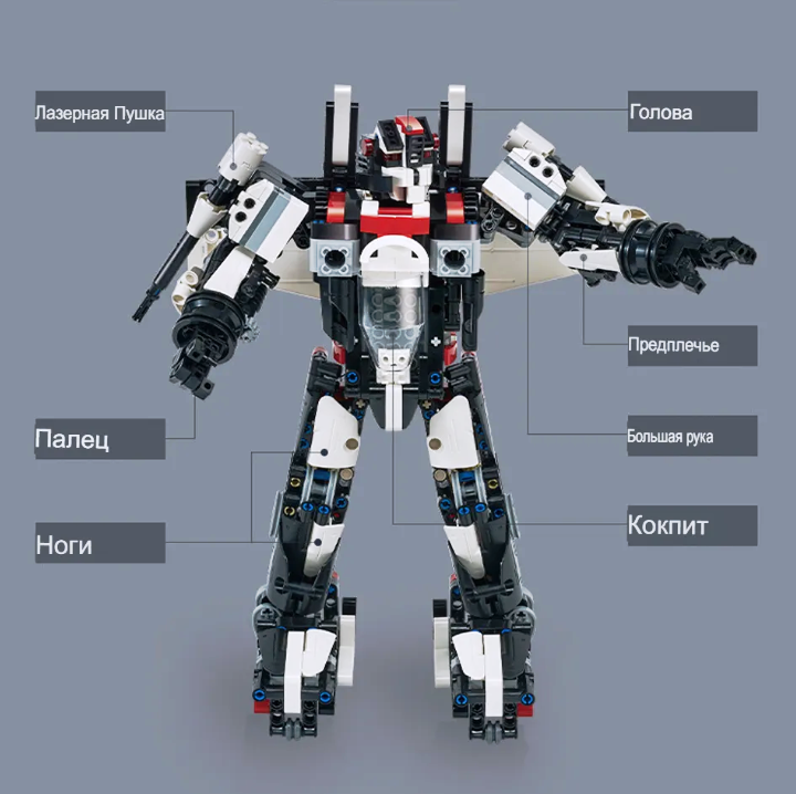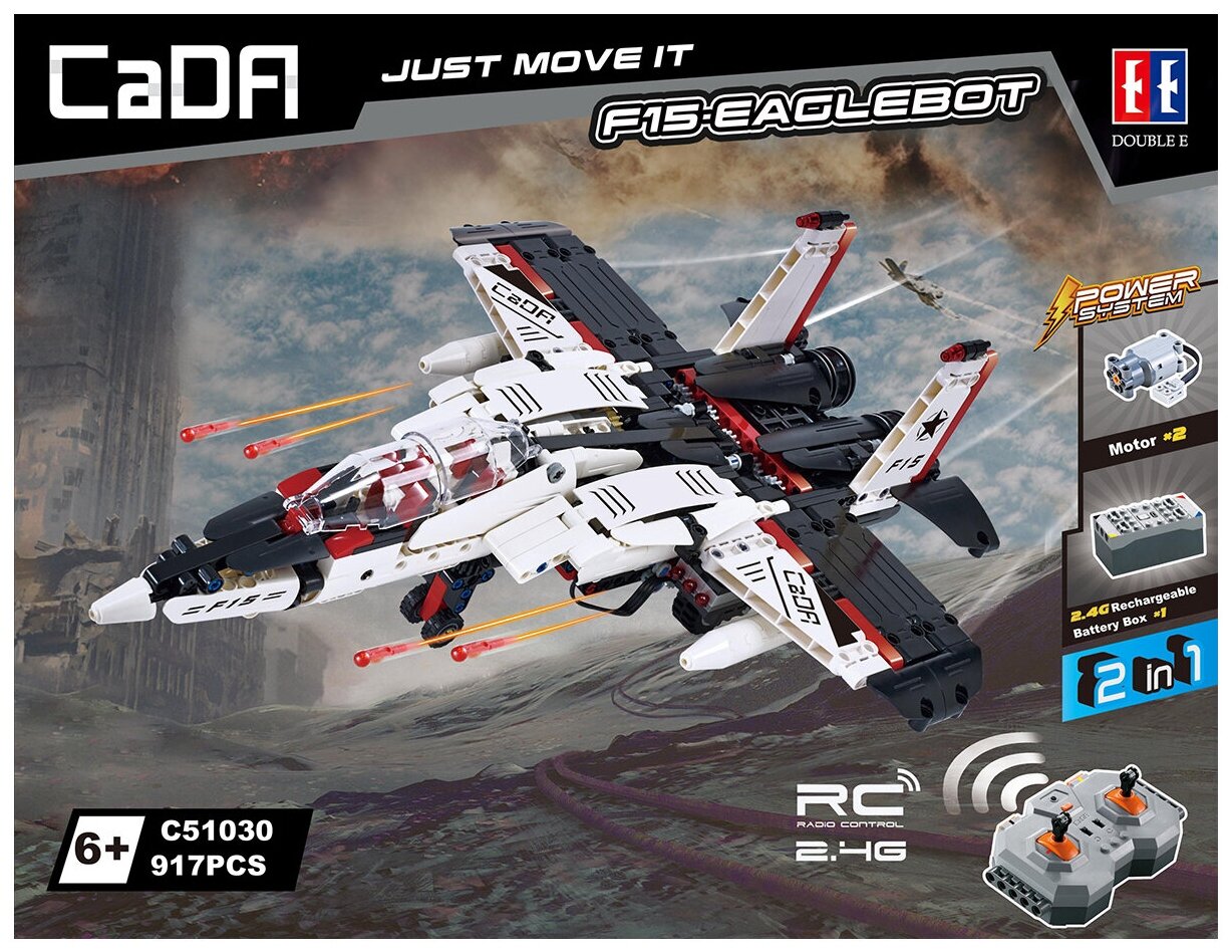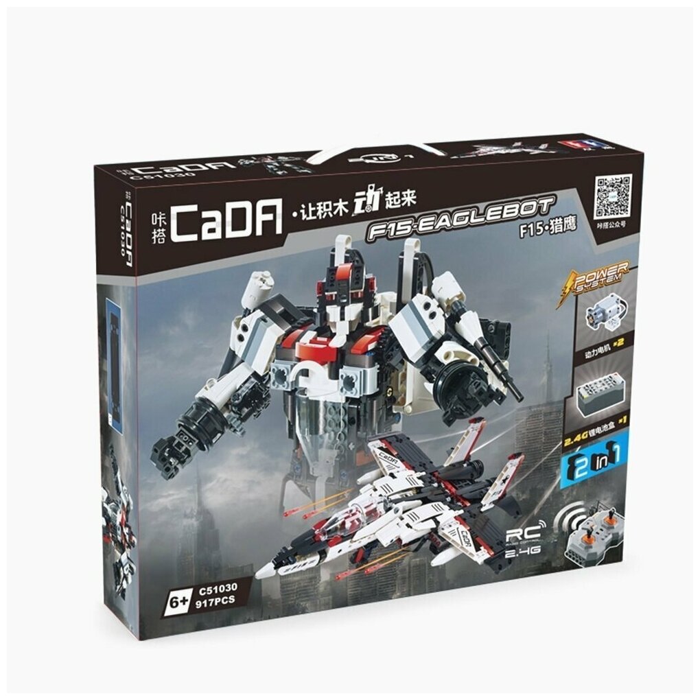 Конструктор Double Egle Робот-истребитель C51030W развивает творческое мышление, усидчивость и мелкую моторику. Выполнен из безопасных для здоровья ребенка материалов. Радиоуправляемый конструктор CADA 2 в 1 трансформер F15-EagleBot (917 деталей) C51030W представляет собой набор 2 в 1 для постройки робота-трансформера и самолета на радиоуправлении и содержит 917 деталей! Робот-Трансформер CaDa Detech С51030W в собранном виде очень подвижный и маневренный, так же вращается голова и руки робота. Второй вариант сборки самолет. Самолет может стрелять пластиковыми стрелами, которые идут в комплекте, активируя выстрелы с пульта. Помимо деталей корпуса и колес, в комплект входят 2 электродвигателя, приемник, аккумулятор 7.4В и пульт! Детали в наборе отлично подогнаны друг к другу, поэтому сборка не вызовет трудностей, а собранная модель не развалится во время игры. Все детали конструктора CaDa Detech C51030W расфасованы по отдельным пакетикам и упакованы в красивую упаковку, которая порадует своим внешним видом, вас и вашего ребенка.