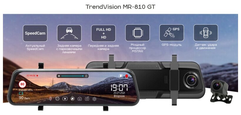 Передовое зеркало-видеорегистратор с функцией SpeedCam и двумя камерами - TrendVision MR-810 GT. Устройство построено на базе производительного процессора Mstar 8336n и оснащено отлично зарекомендовавшей себя матрицей – GC2053. Такая начинка позволяет видеорегистратору записывать видео в разрешении вплоть до 2к. (В один канал). Видеорегистратор комплектуется выносной fullHD камерой с функции парковочного ассистента. Используя TrendVision MR-810 GT, вы можете быть уверен в том, что устройства контроля не застанут вас врасплох. Выносной GPS-модуль с функцией SpeedCam гарантирует стабильное соединение со спутниками, а часто обновляемая база данных несет себе информацию о местоположении практически любых камерах и радарах.