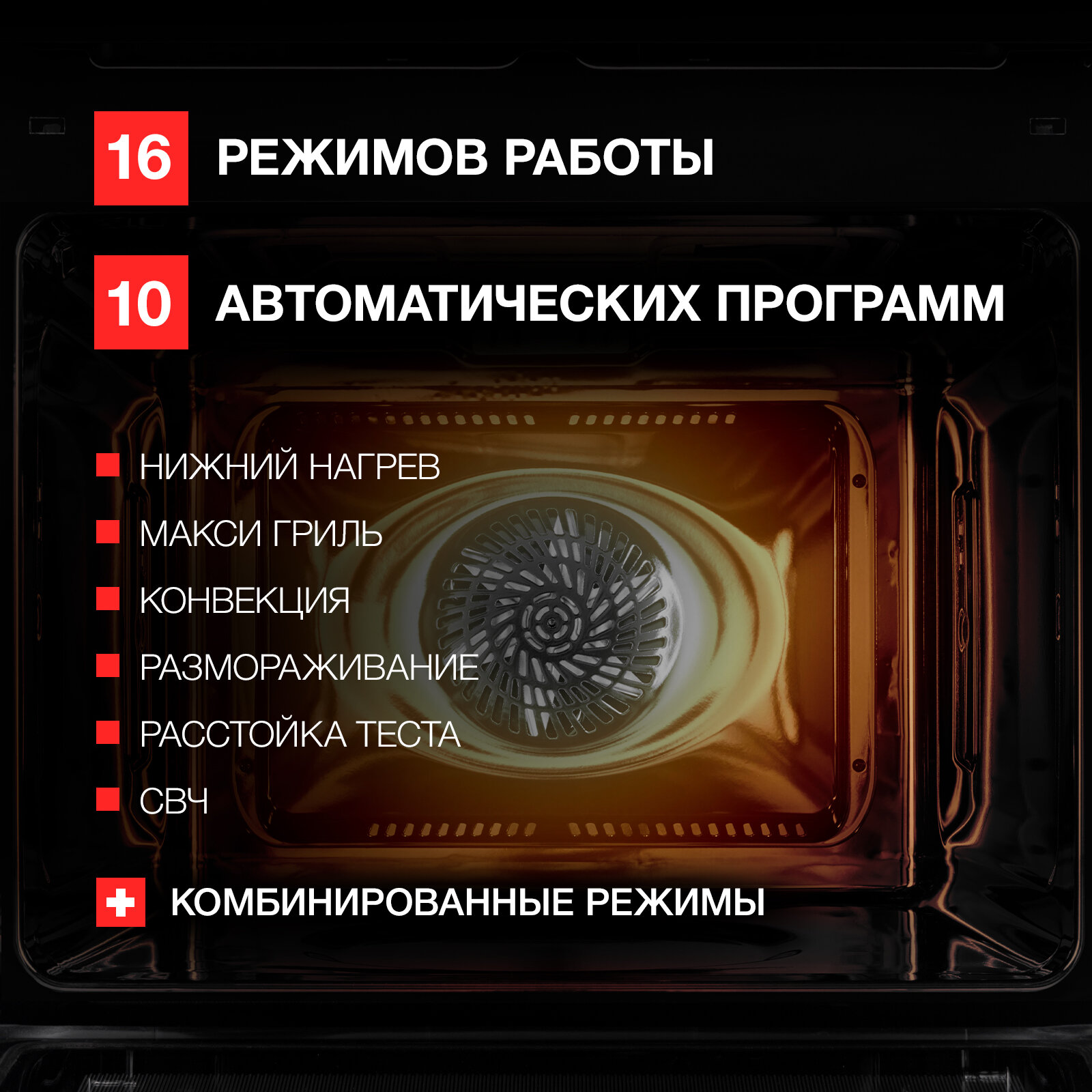 | Режимы работы | Нижний нагрев,Нижний нагрев + конвекция,Разморозка,Гриль,Гриль + конвекция,Пицца,Большой гриль,Освещение духовки,Очистка |