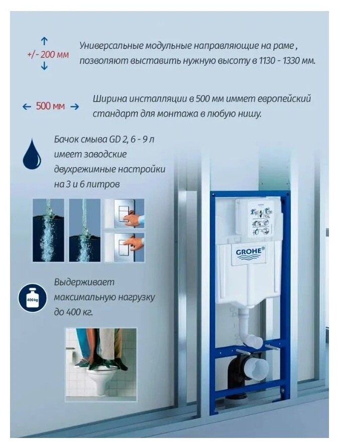 | Комплектация | бачок; инструкция; комплект крепежа; монтажная рама; панель смыва; подводка |