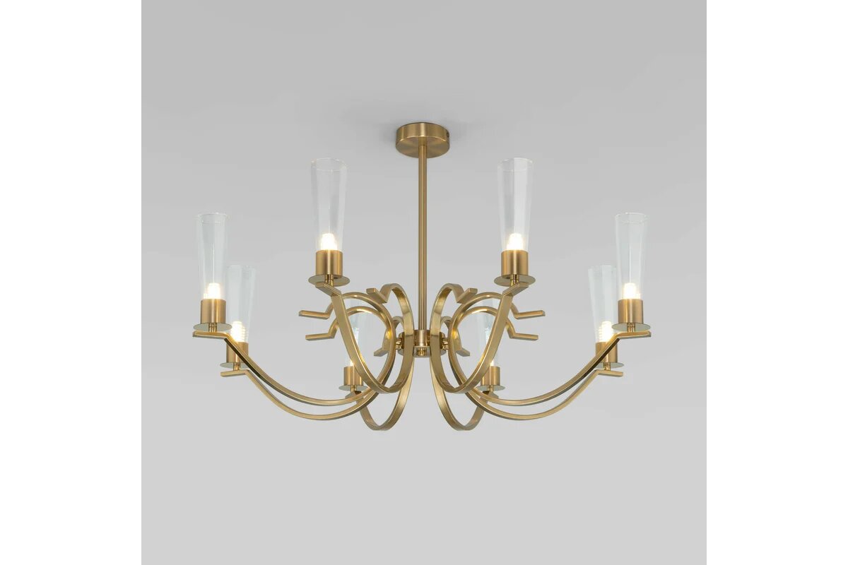 Потолочная люстра / светильник Евросвет Rosher 60141/8 в цвете латунь со стеклянными плафонами предназначена для создания основного освещения в современных и классических интерьерах, подходит для различных типов помещений: гостиная; спальня и рассчитана на площадь освещения 12 кв. м. В качестве источника света используются сменные лампы с цоколем G9. Патрон рассчитан на максимальную мощность ламп накаливания 7 Вт. Лампочки в комплект не входят и докупаются дополнительно в зависимости от требуемой цветовой температуры (теплый, холодный свет). Корпус люстры выполнен из высококачественного и прочного металла с надежным латунным покрытием. Люстра легко устанавливается при помощи крепежной планки, которая обеспечивает надежную фиксацию на потолке. Серия светильников Rosher многофункциональна и представлена в двух цветах – хром и латунь. Отличительной особенностью серии Rosher являются утонченные плафоны из стекла, напоминающие бокалы для шампанского. В данную серию входят модели: потолочная люстра цвета хром и латунь с 6 и с 8 рожками, бра в цвете хром и латунь.