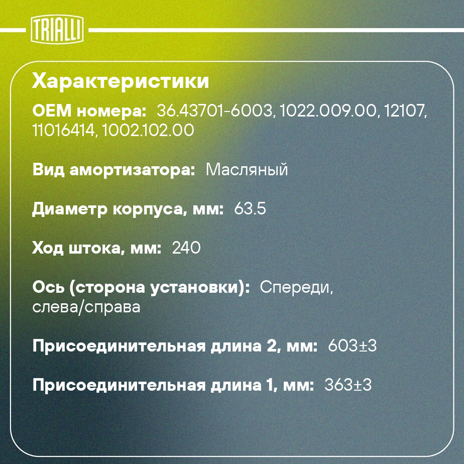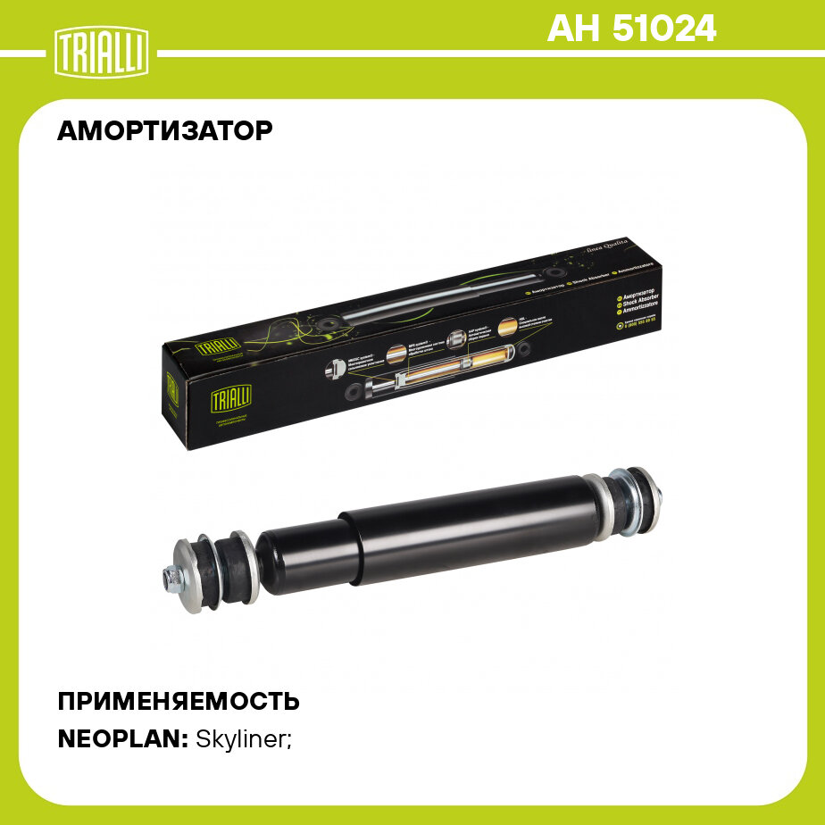 Амортизатор TRIALLI AH 51024 для Neoplan N116/208/209/214/216/220/312/313 играет ключевую роль в обеспечении комфорта и безопасности во время движения: гасит колебания кузова и предотвращает его раскачку на неровностях, что улучшает управляемость и стабильность автомобиля.Преимущества амортизаторов подвески TRIALLI:Многоуровневая система обработки штока, что повышает его износостойкость.Хромированное покрытие для защиты от коррозии и увеличения срока службы.Многокромочное сальниковое уплотнение, обеспечивающее надежную герметизацию.Полностью автоматизированная сборка поршня для высокой точности.Специальное масло высокой степени очистки с комплексом присадок для оптимальной работы в любых условиях.Соответствие международным стандартам обеспечивает высокое качество.TRIALLI — это российская инженерно-маркетинговая компания, специализирующаяся на производстве автокомпонентов для легковых и грузовых автомобилей. С момента своего основания в 2005 году компания ставит перед собой цель повысить надежность автозапчастей, ориентируясь на качество, доступность и доверие потребителей. Продукция TRIALLI соответствует международным стандартам и регулярно проходит контроль в собственной лаборатории.Для достижения максимальной эффективности амортизатора TRIALLI AH 51024 рекомендуется регулярно проверять его состояние и заменять при первых признаках износа или утечки масла.