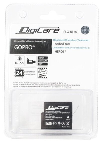 Аккумулятор Digicare совместим с экшн-камерой GoPro Hero 5. Он полностью соответствует спецификациям производителя в части размеров, емкости и электротехнических характеристик. Применение современной литий-ионной технологии делает его очень легким и долговечным. Кроме того, преимуществами аккумулятора являются отсутствие эффекта памяти и сохранение стабильной отдачи при низкой температуре.