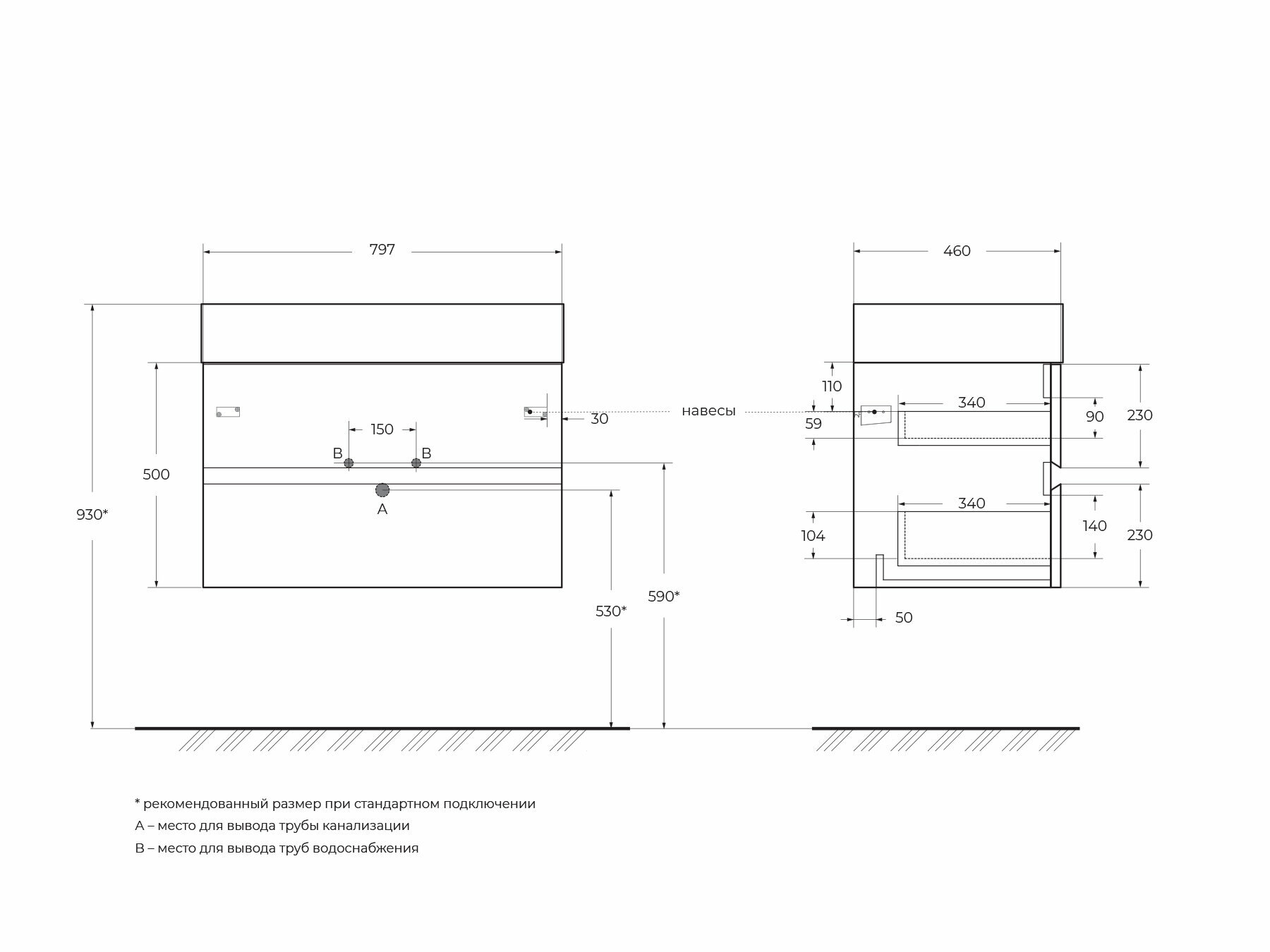 - Габариты корпуса тумбы (ШхВхГ): 797х500х460 мм.