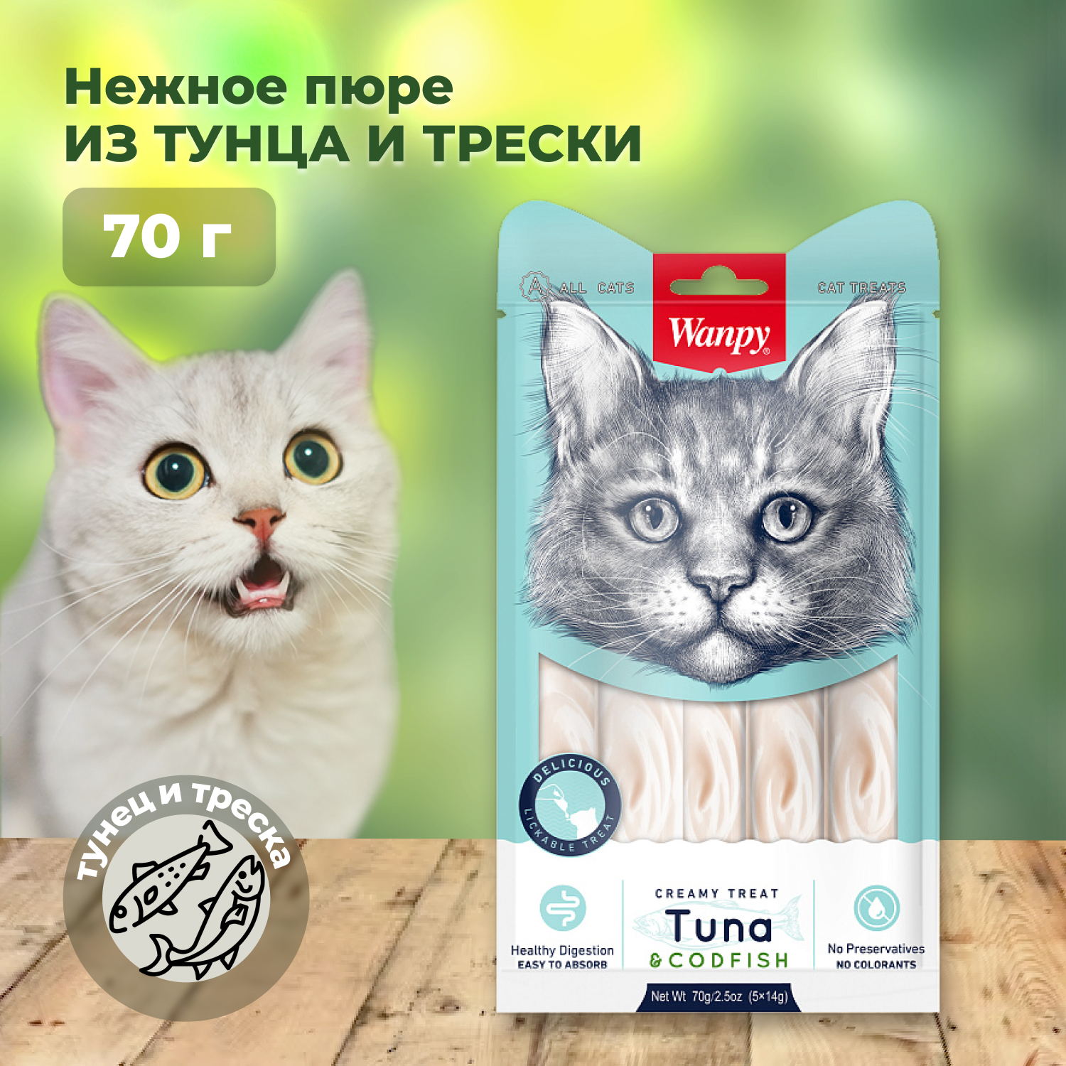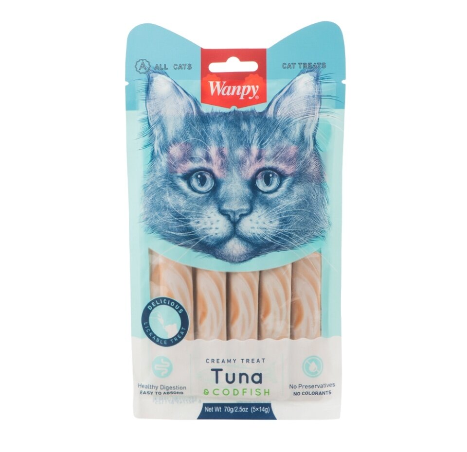 Wanpy Cat Лакомство для кошек "Нежное пюре" (Тунец и треска 70 г.)