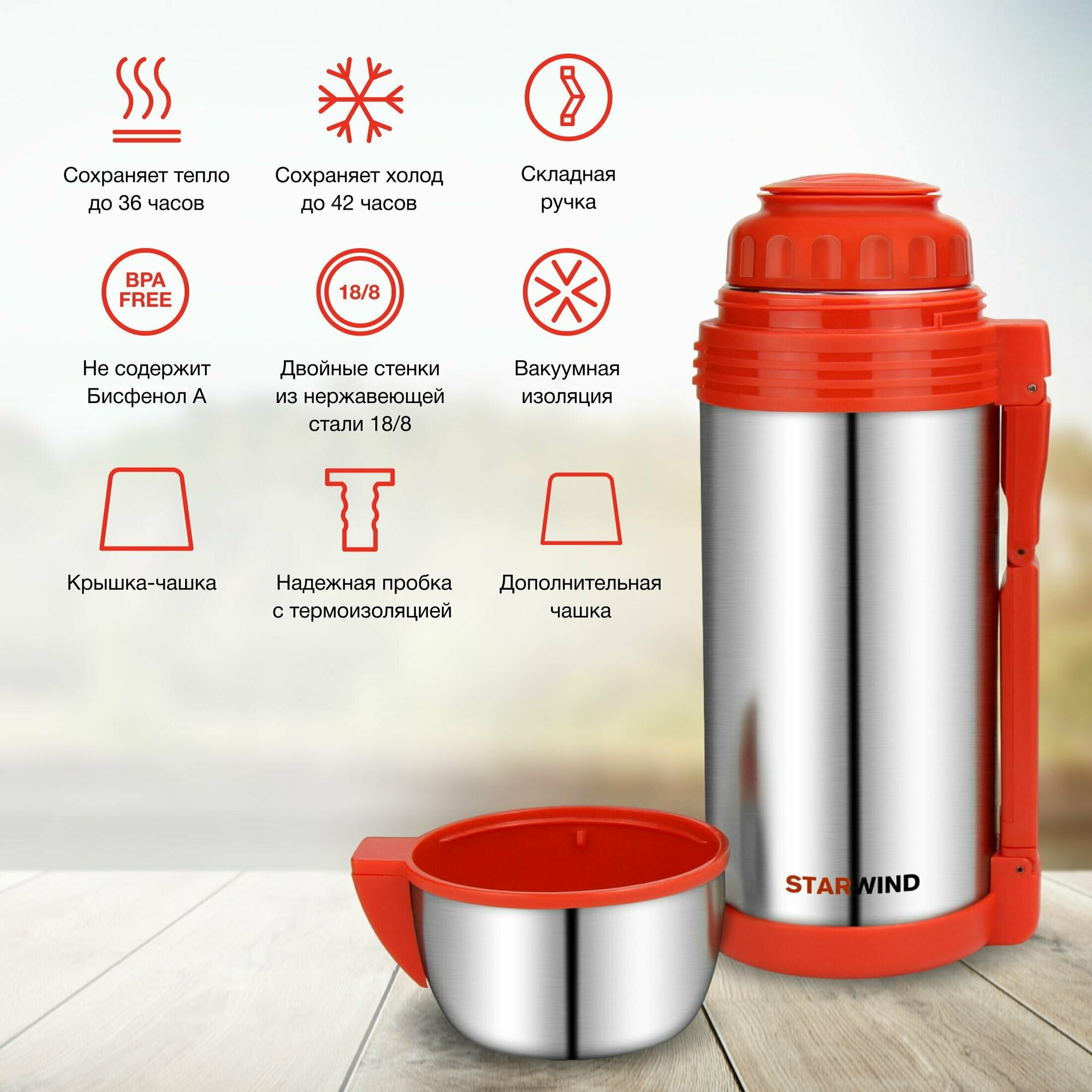 Где бы ни оказался обладатель термоса, на рыбалке, на прогулке, в походе или экспедиции, у него всегда будет с собой 1,8 литра тёплого питья. Поэтому Starwind 30-1800 – самый лучший подарок на любой праздник для каждого, кто любит проводить время активно и на открытом воздухе.