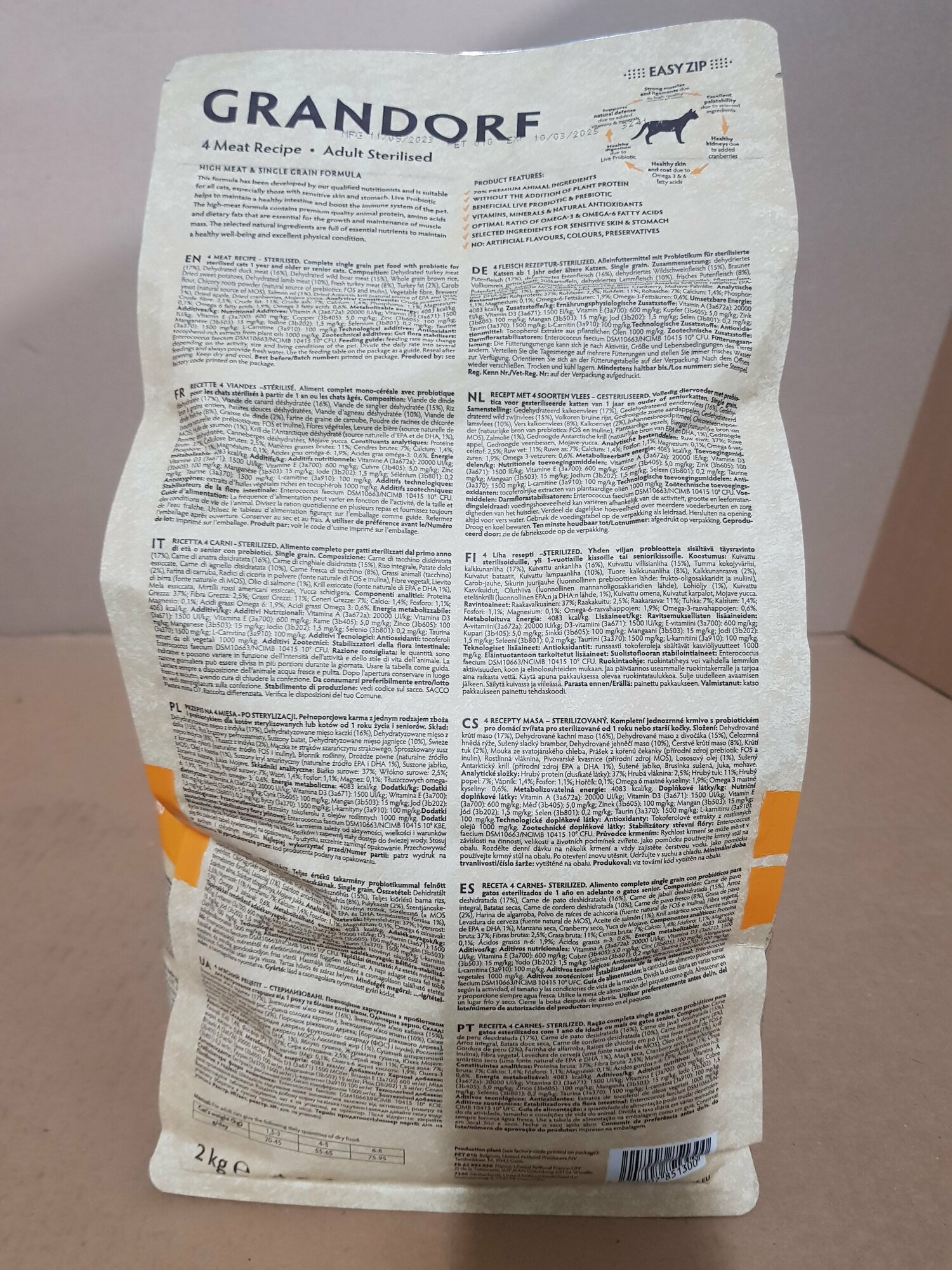 Grandorf Probiotic Sterilised. Сухой корм Грандорф с 4 видами мяса и рисом предназначен для взрослых стерилизованных кошек всех пород. По ингредиентному составу относится к кормам класса холистик. Благодаря высокому содержанию мяса индейки, утки, кролика и отстутствию мяса курицы, данный корм обладает гипоалергенными свойствами и хорошо подойдет большенству кошек, страдающих пищевой аллергией.
