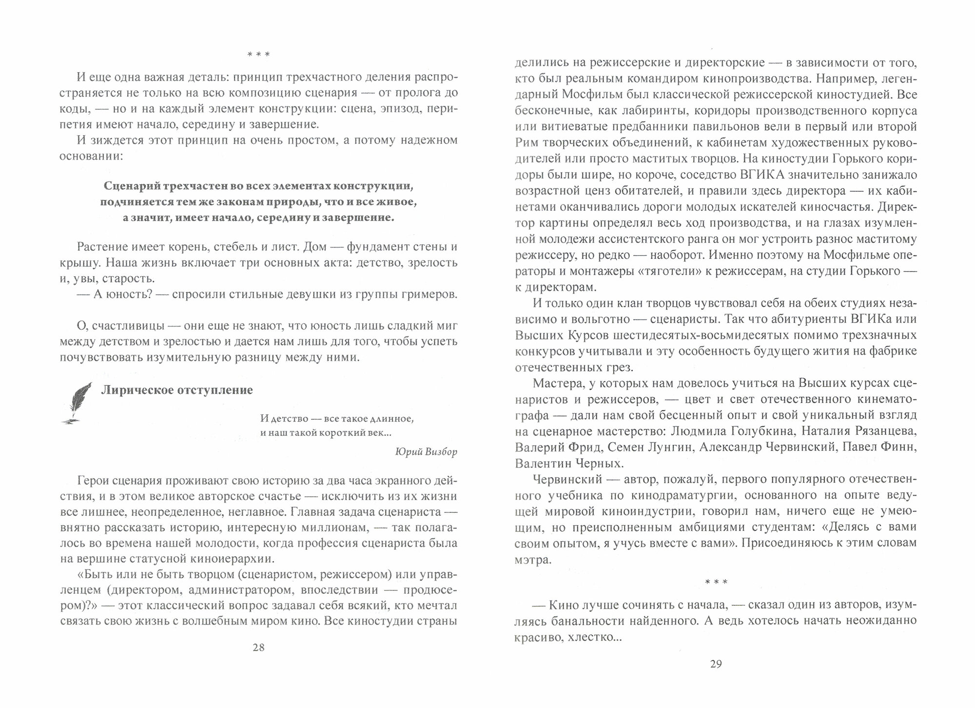 Великая миссия человека, именуемого в дальнейшем сценарист, состоит в очень простой вещи: создать прочную, гармоничную основу очередного проникновения в бессмертие, которым является каждое высокохудожественное произведение - кинофильм в том числе. Именно поэтому написанный не только от ума, но и от души живой сценарий есть первое, еще доэкранное, прикосновение автора и героя, а вместе с ними и зрителя, к Вечности. Ремесло же сценаристу нужно лишь для того, чтобы сделать это прикосновение максимально точным. Вот собственно и все. Осталось определить предмет: сценарий - это рассказанное время. В учебном пособии есть правила, инструменты, ключи, лекала и даже верстаки, которые помогут сценаристам разобраться в их многотрудном деле, а всем прочим представителям кино-телецеха или просто зрителям - в многомерном явлении под названием сценарий.