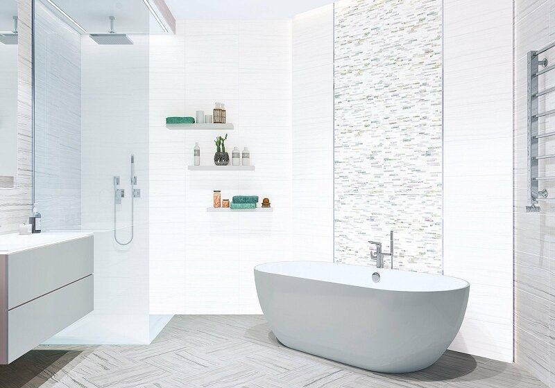 Эта светлая керамическая плитка под камень смотрится минималистично, но при этом роскошно. Я увидела её в шоу-руме и мне она очень понравилась. Качественная и относительно недорогая. К тому же я сэкономила на доставке - плитку мне привезли бесплатно. Спасибо!