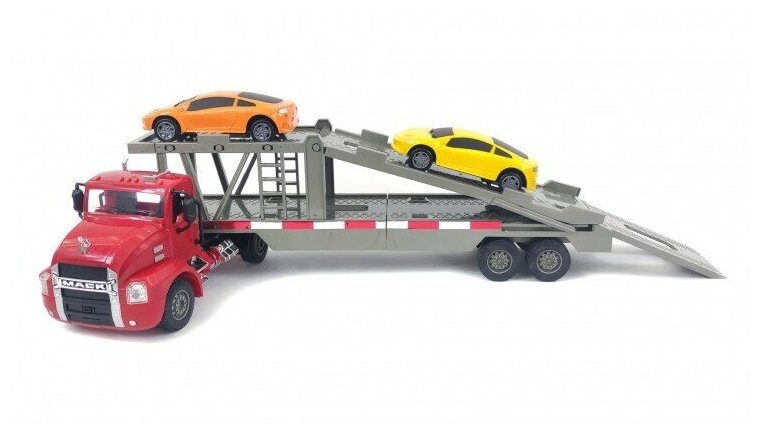 Игрушка от бренда Double Egle Автовоз MACK E583-003 несомненно понравится вашему ребенку. Автовоз Mack Car Transporter с 2 автомобилями, E583-003 производства известного на рынке игрушек производителя Double Eagle максимально приближен к внешнему виду реальных автомобилей, включая мельчайшие детали, и представлена в мас шт.абе 1:26. Тягач движется во всех направлениях. При движении светятся фары. Транспортировочная рама присоединяется по принципу седельного тягача, её можно отсоединить и поставить отдельно. Двухуровневая конструкция транспортировочной рамы, имитирующая транспортную функцию каретки. Верхнюю раму можно опускать / поднимать вручную, заднюю пластину нижней рамы можно опускать / задвигать вручную. В комплект также включены две мини-машинки, чтобы играть было веселее.