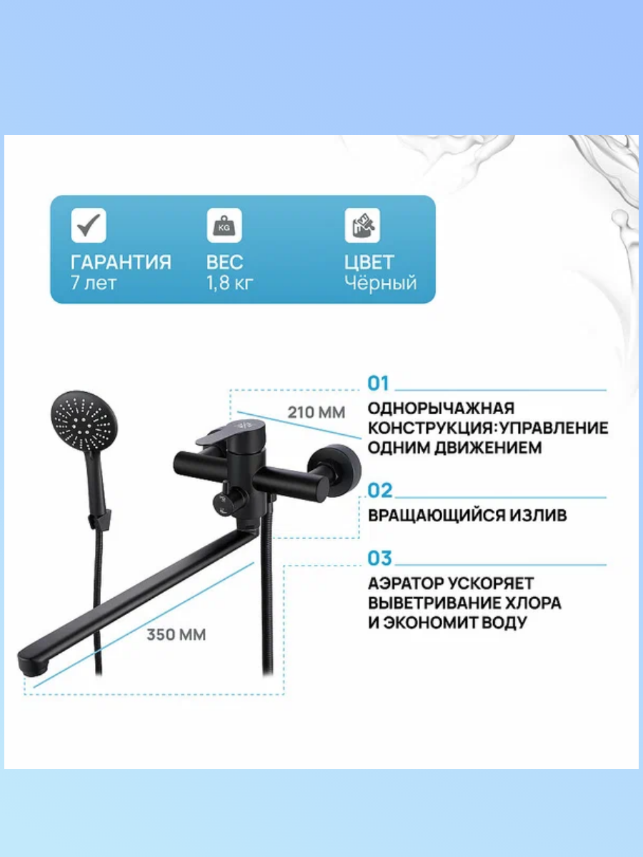 | Комплектация | аэратор; держатель для душа; душевой шланг; излив; лейка; набор крепежа; отражатели; смеситель; эксцентрики |