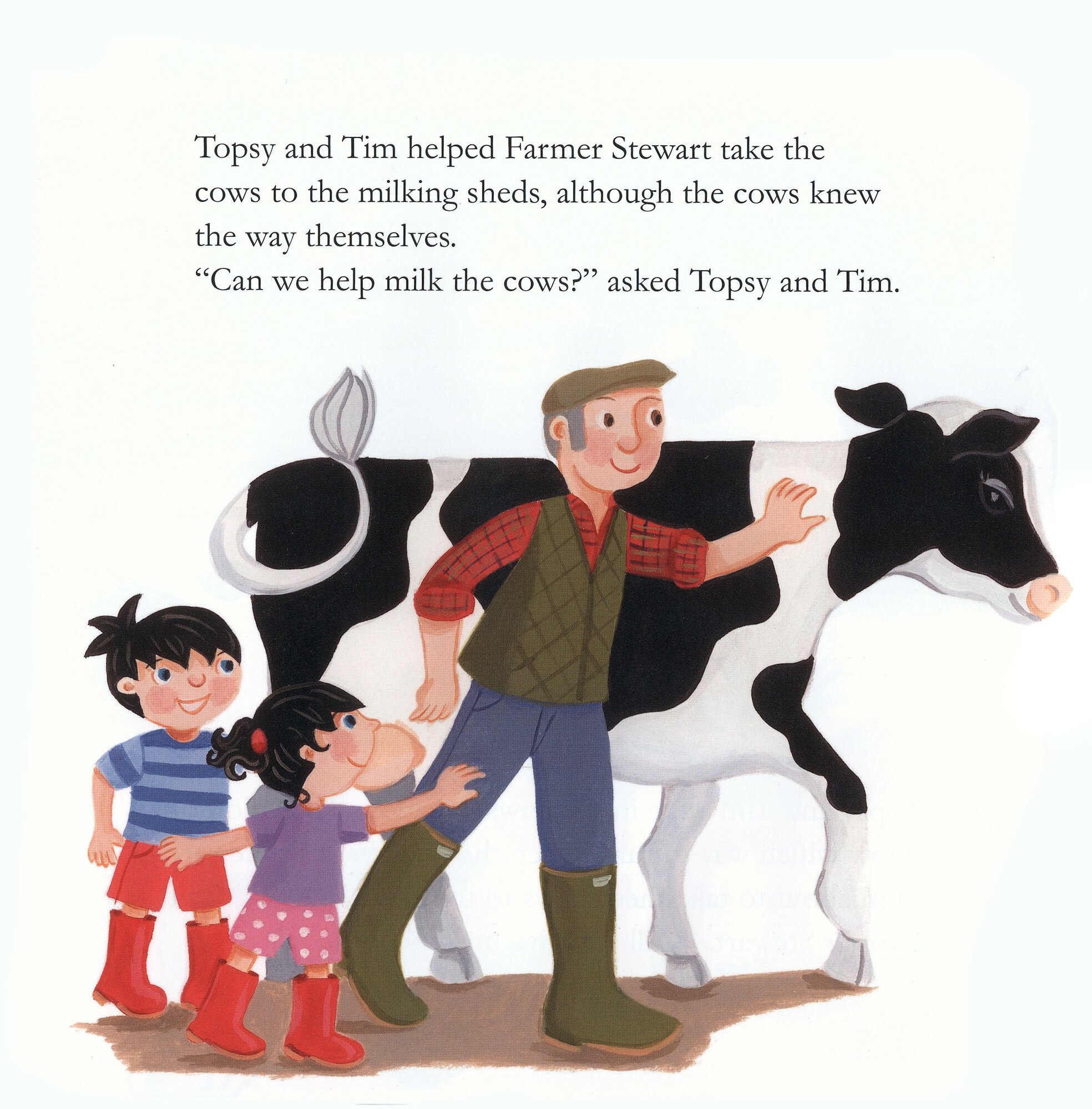 In Topsy and Tim At the Farm, the children meet all kinds of interesting animals. They help collect eggs from the chickens, and find some little ducklings learning how to swim. They are a little bit frightened when they get chased by some large geese, but Farmer Stewart soon finds them a nice job to do, helping to feed a calf.