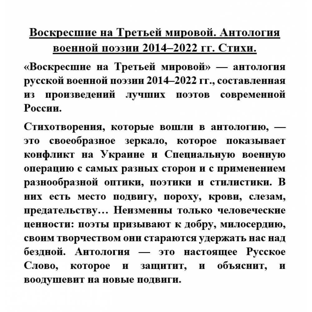 "Воскресшие на Третьей мировой" - антология русской военной поэзии 2014-2022 гг., составленная из произведений лучших поэтов современной России.