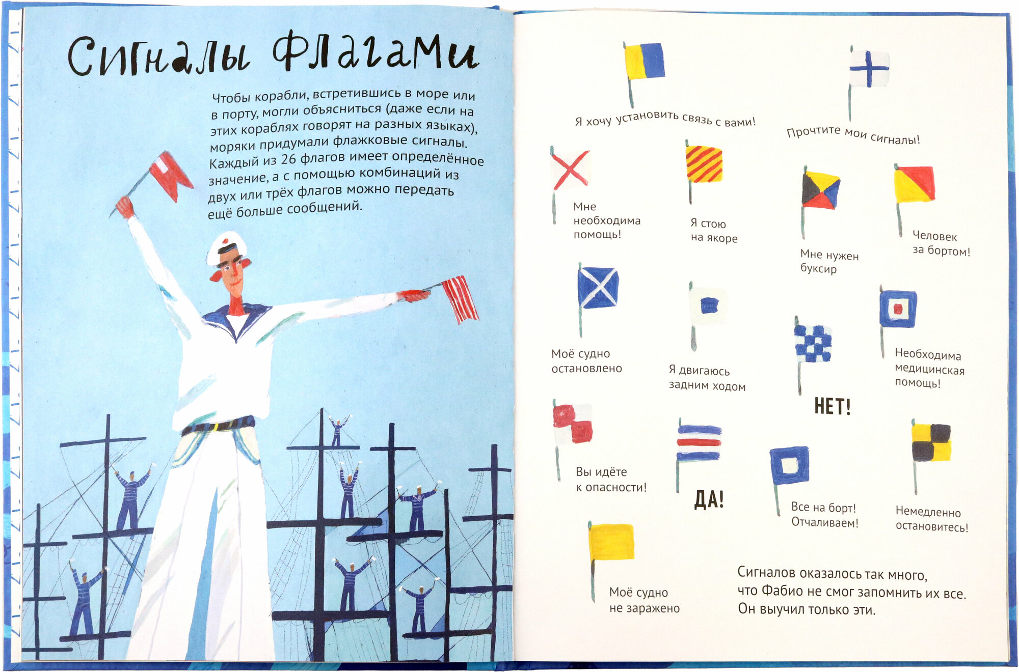 Подарила племянику эту книгу. Как же весело мы изучаем азбуку Морзе, сигнальные флаги. И вот уже несколько дней всей семьей вяжем морские узлы. А на ужин- макароны по флотски! Благодарю автора за яркую, познавательную книжку для настоящих маленьких матросов!
