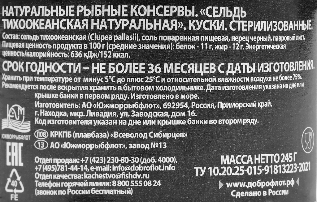 Сельдь натуральная, тихоокеанская, от бренда «Доброфлот» - это высококачественные рыбные консервы, приготовленные из свежей рыбы, выращенной в природной среде. Этот продукт соответствует госту и включает в себя только натуральные ингредиенты морского происхождения.Сельдь натуральная, тихоокеанская, от «Доброфлот» произведена в строгом соответствии с гостом, где используются только натуральные ингредиенты. В ее состав входят сельдь тихоокеанская, соль пищевая, перец черный и лавровый лист.Эти консервы сельди подходят для приготовления разнообразных блюд: от закусок до салатов и бутербродов. Они станут отличным дополнением к вашему столу и приносят пользу для здоровья благодаря содержанию полезных микроэлементов, таких как аминокислоты, фосфор и калий.Продукт, предлагаемый «Доброфлот», не содержит ГМО и красителей, что делает его безопасным для употребления. Попробуйте сельдь в консервах от «Доброфлот» и наслаждайтесь вкусом натуральной рыбы, приготовленной с заботой о вашем здоровье.