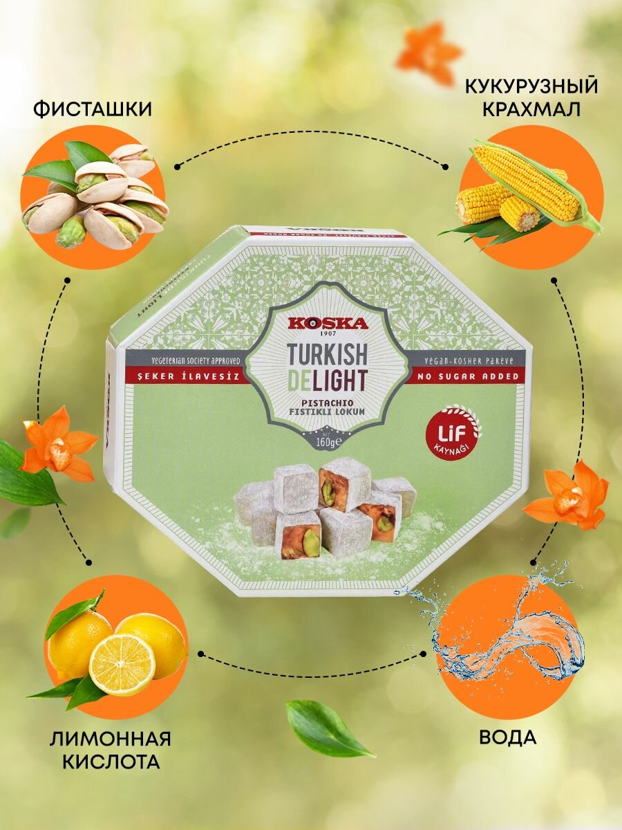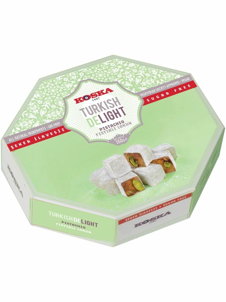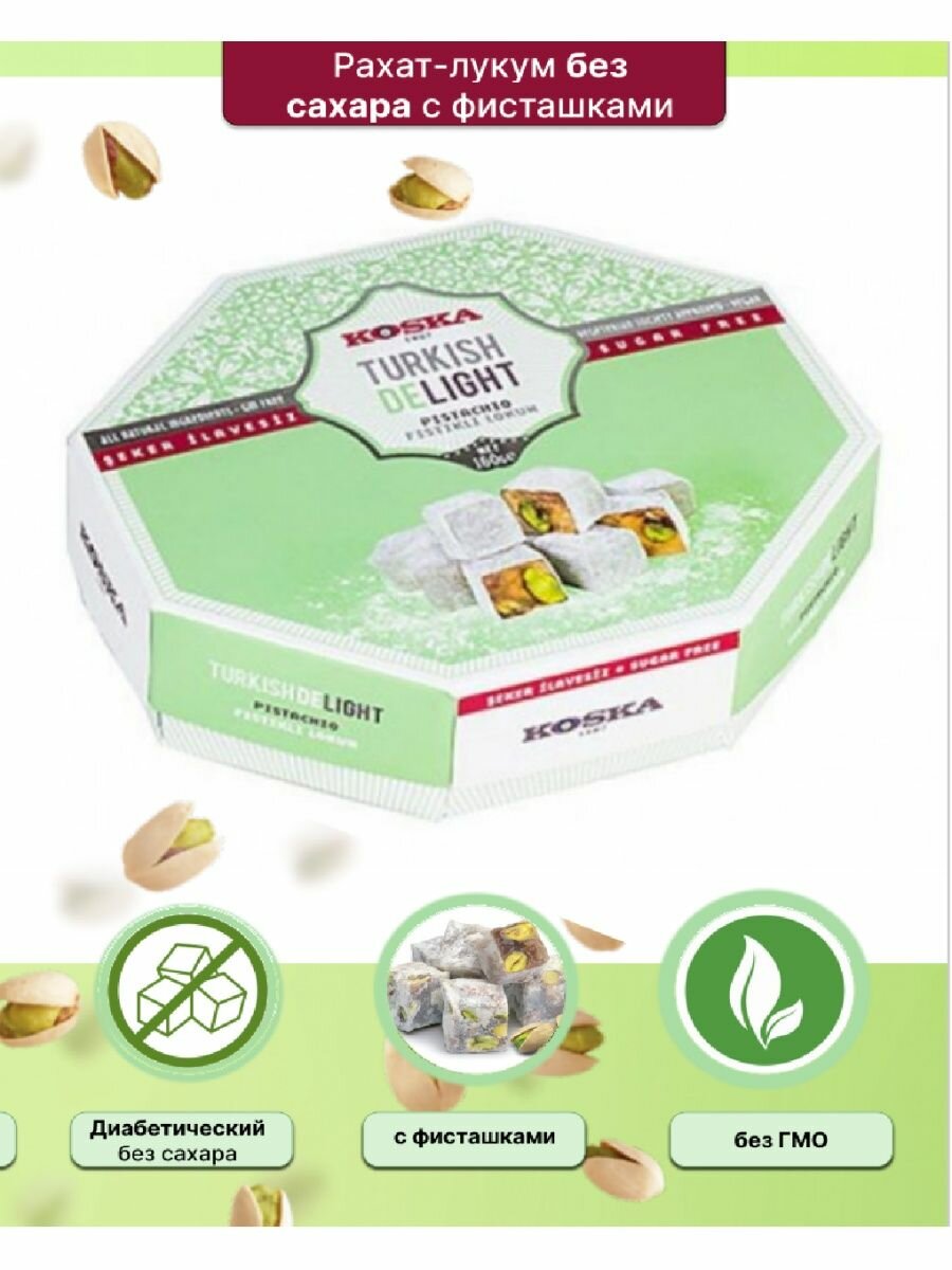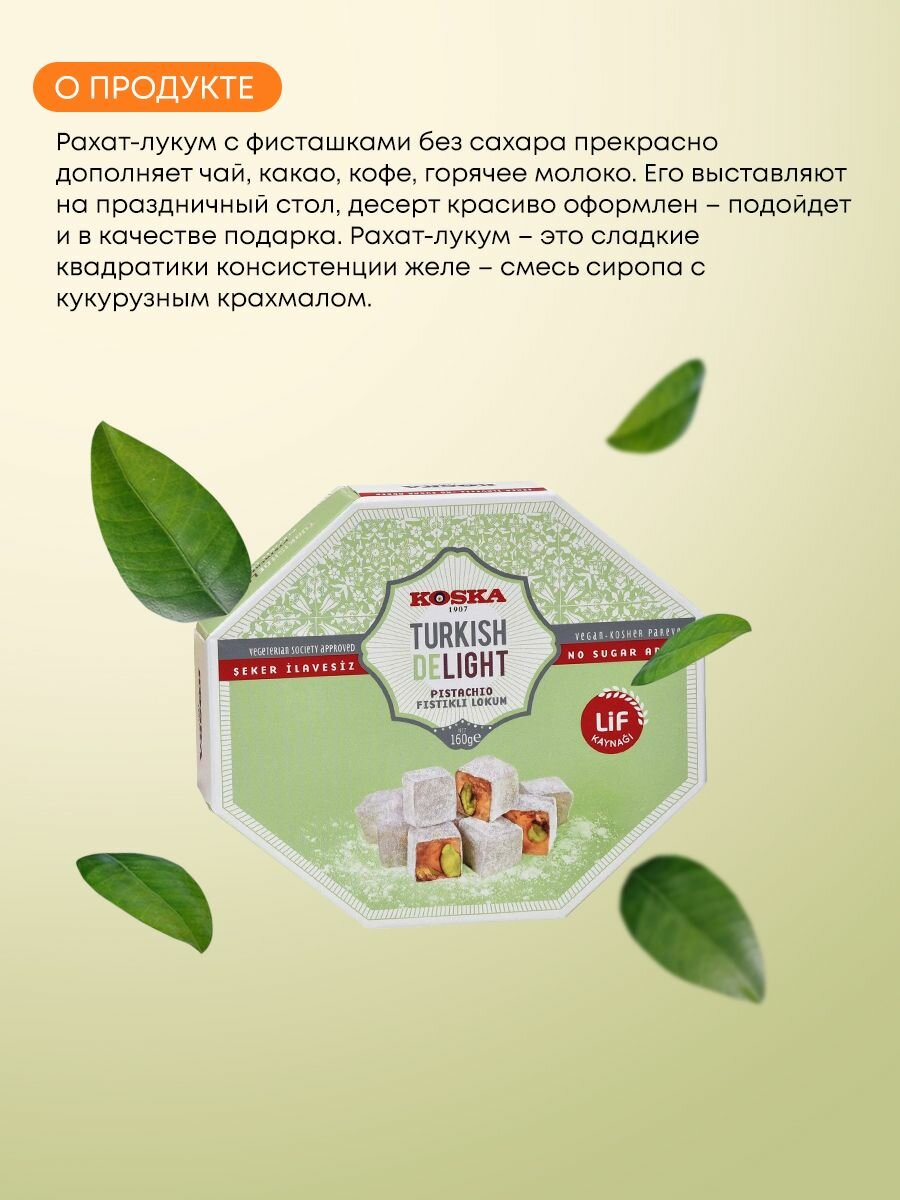 Лакомство, доступное тем, кто следит за количеством употребляемого сахара. Натуральный рахат-лукум с фисташками поднимает настроение и заряжает энергией, а стильная и яркая упаковка делают сладость универсальным подарком для родных и знакомых. Способ применения:Продукт готов к употреблению в пищу. Противопоказания:Аллергия на один или несколько ингредиентов в составе продукта. Состав:Мальтитный сироп, изомальт, фисташки, вода, волокна корня цикория, кукурузный крахмал, лимонная кислота.
