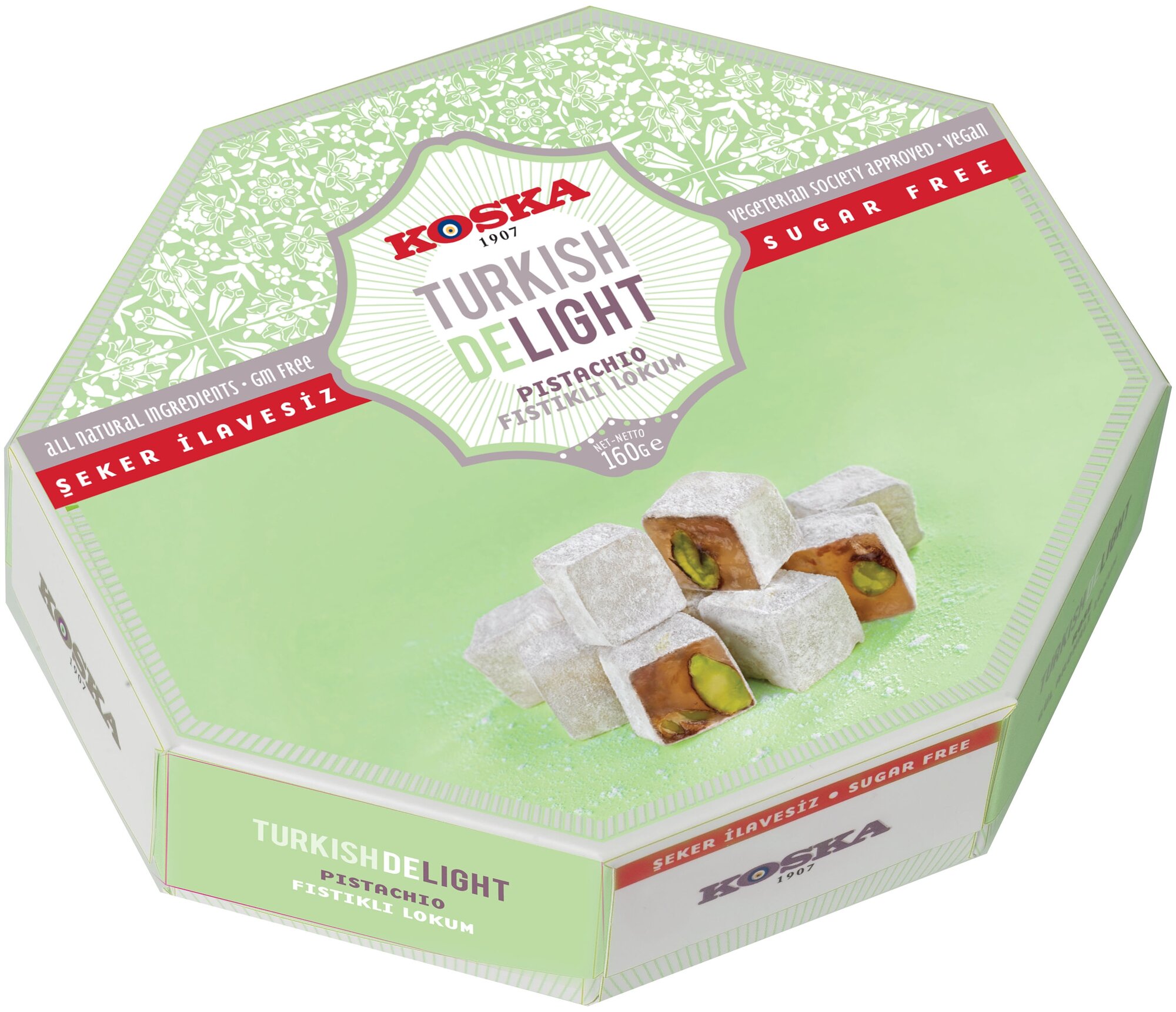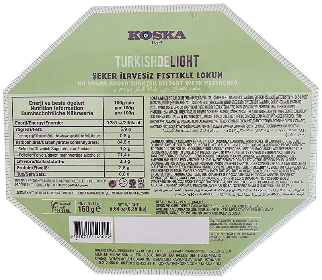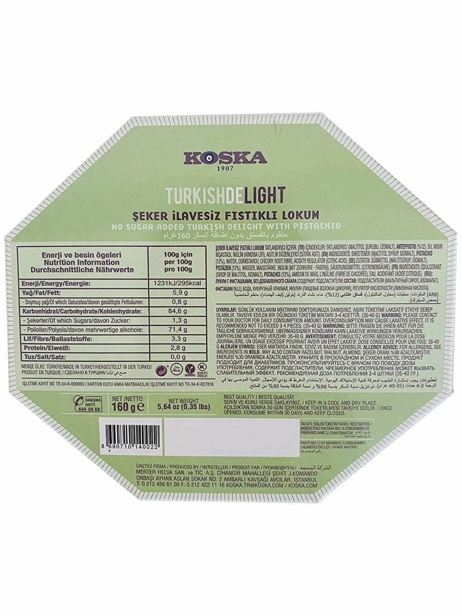 Лакомство, доступное тем, кто следит за количеством употребляемого сахара. Натуральный рахат-лукум с фисташками поднимает настроение и заряжает энергией, а стильная и яркая упаковка делают сладость универсальным подарком для родных и знакомых. Способ применения:Продукт готов к употреблению в пищу. Противопоказания:Аллергия на один или несколько ингредиентов в составе продукта. Состав:Мальтитный сироп, изомальт, фисташки, вода, волокна корня цикория, кукурузный крахмал, лимонная кислота.