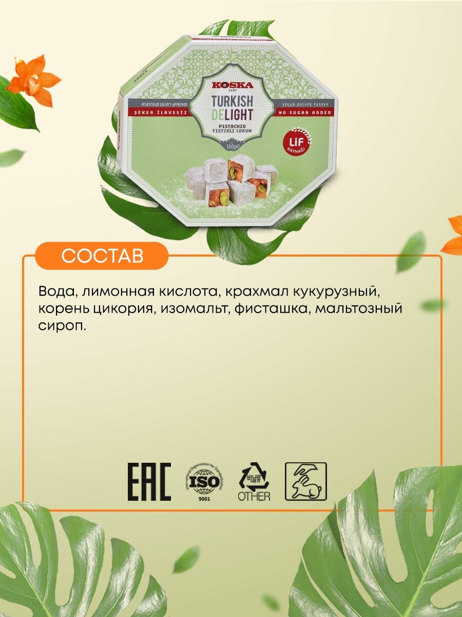 | Состав | Мальтитный сироп, изомальт, фисташки, вода, волокна корня цикория, кукурузный крахмал, лимонная кислота. |