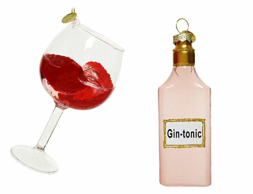 Вы любите коктейль джин-тоник? А если налить его в бокал со льдом и ароматной клубникой? Непременно попробуйте - может быть это ваш любимый праздничный напиток! Характеристики:Размер - 12-14 см.Материал - стекло.Набор - 2 игрушки.Цена указана за набор. Производитель KAEMINGK, Голландия.Производство размещено в Китае.