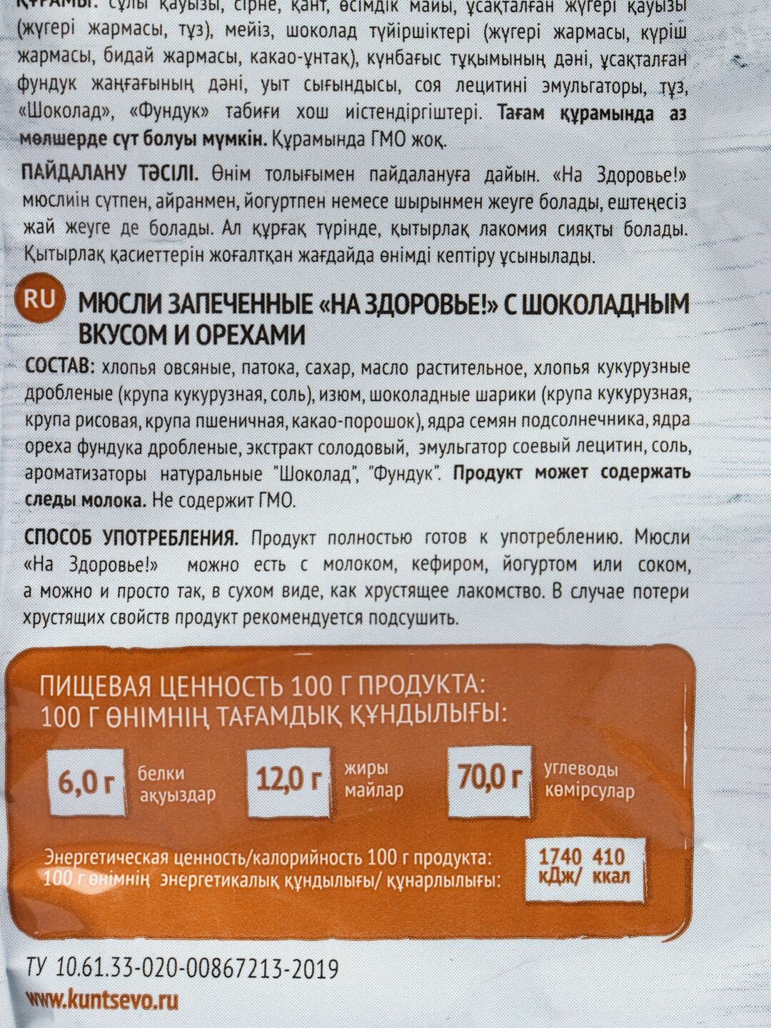 Мюсли шоколадные с дроблеными орехами «Кунцево» могут стать прекрасным завтраком или сытным перекусом. Они богаты клетчаткой, витаминами, углеводами, необходимыми для получения достаточного количества энергии. Производитель использует собственное сырье для выпуска мюслей. Предлагаются в крупных розничных сетях от Калининграда до Сахалина, в продаже оптовыми партиями.Полезное лакомство - мюсли могут стать прекрасным десертом, в их составе больше жиров за счет натуральных орехов, делающих перекус еще более сытным. Потреблять их можно по-разному, все зависит от ваших предпочтений. При желании можно дополнить продукт молоком, йогуртом, кефиром. В составе мюслей хлопья овсяные, патока, сахар, масло растительное, хлопья кукурузные дробленые (крупа кукурузная, соль), изюм, шарики из шоколада (крупа кукурузная, крупа рисовая, крупа пшеничная, какао-порошок), ядра семян подсолнечника, ядра ореха фундука дробленые, экстракт солодовый, эмульгатор соевый лецитин, соль, ароматизаторы натуральные: шоколад, фундук.